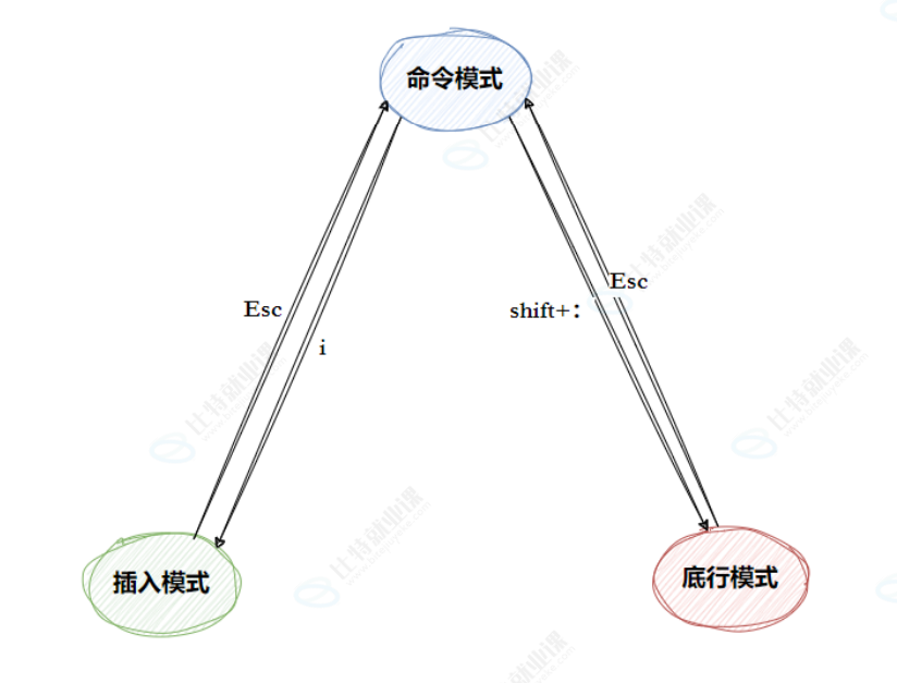 我们要熟知的vim模式要有三种,分别是命令模式(command mode)、插入模式(Insert mode)、和底行模式(last line mode),他们分别的功能如下: