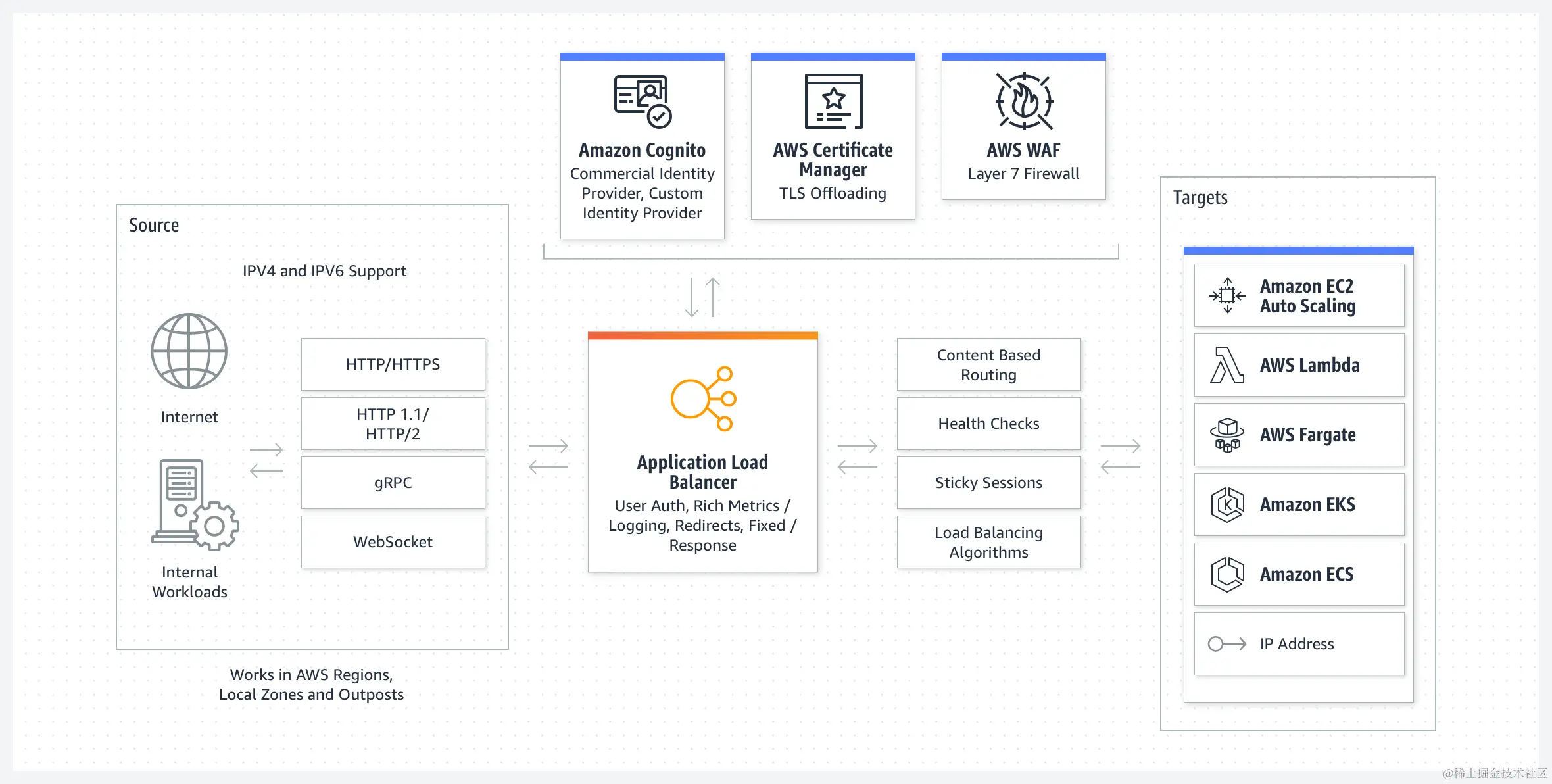 如下图,AWS ELB充当运行在AWS上的动态API服务的总入口,LB可以将流量分布到后面的多种计算平台,并在多个AWS可用区和计算节点间分配网络流量以提高应用程序可扩展性和可靠性。
