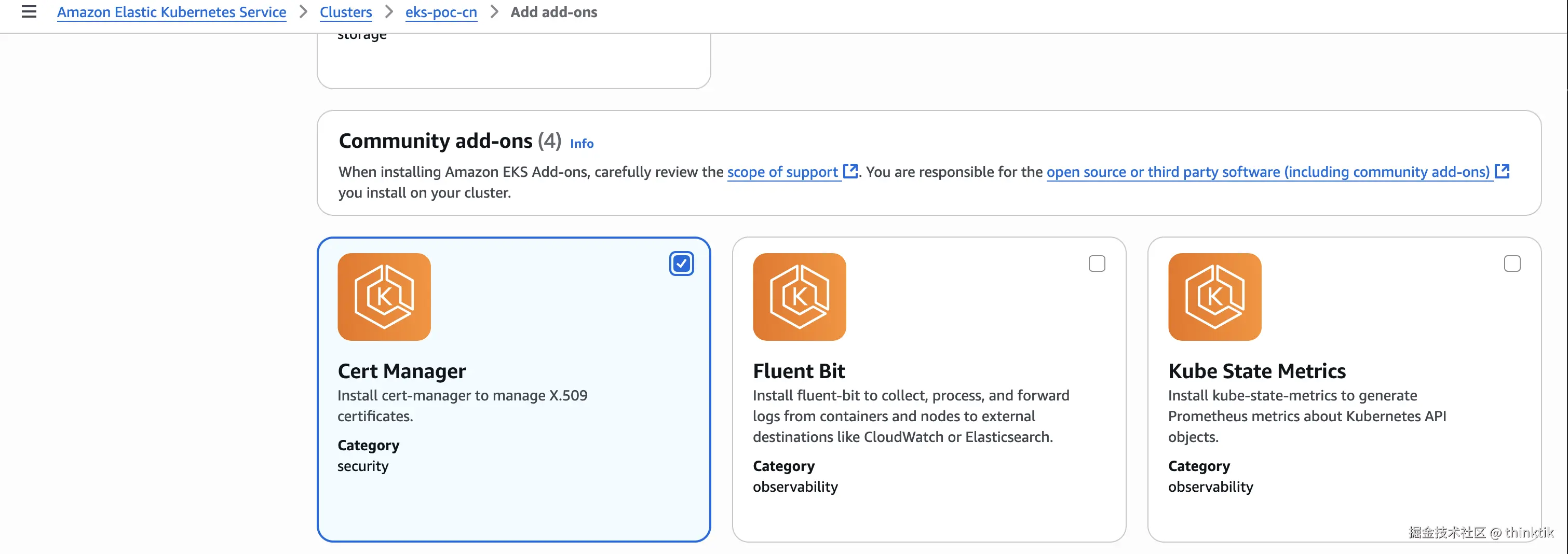 我们需要安装cert-manager以便将证书配置注入Webhook,最简单的方式就是在AWS EKS插件商店中国进行可视化安装。