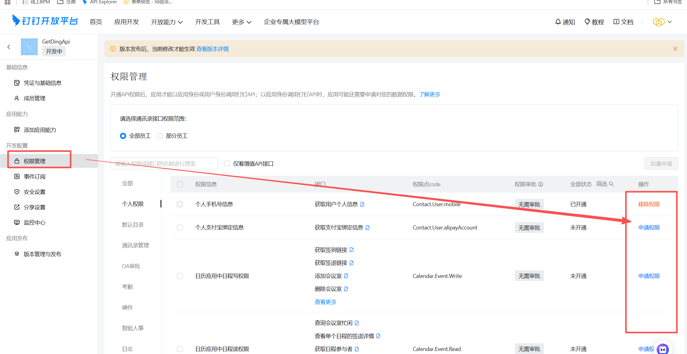 这里要用到很多权限:比如读取部门,读取用户,读取考勤数据的权限 ,这个你可以在后面参照我的代码请求,根据代码报错,去开通对应权限即可。
