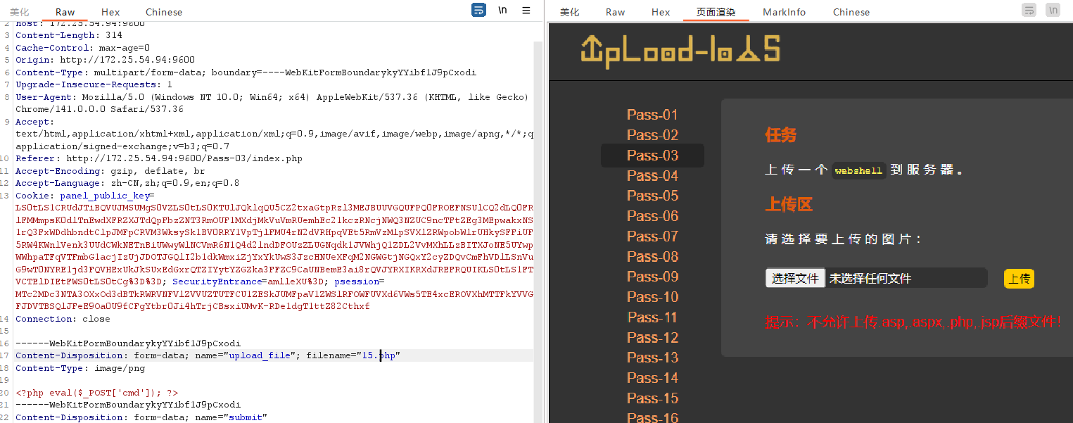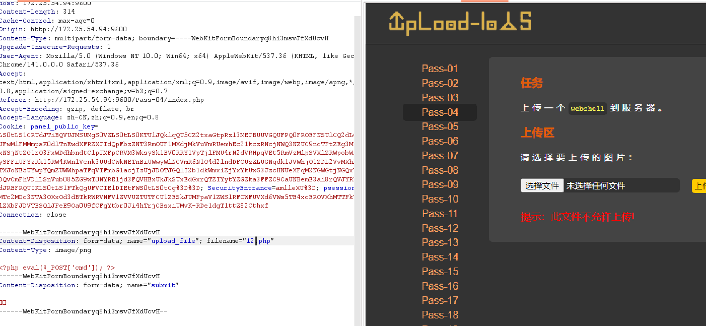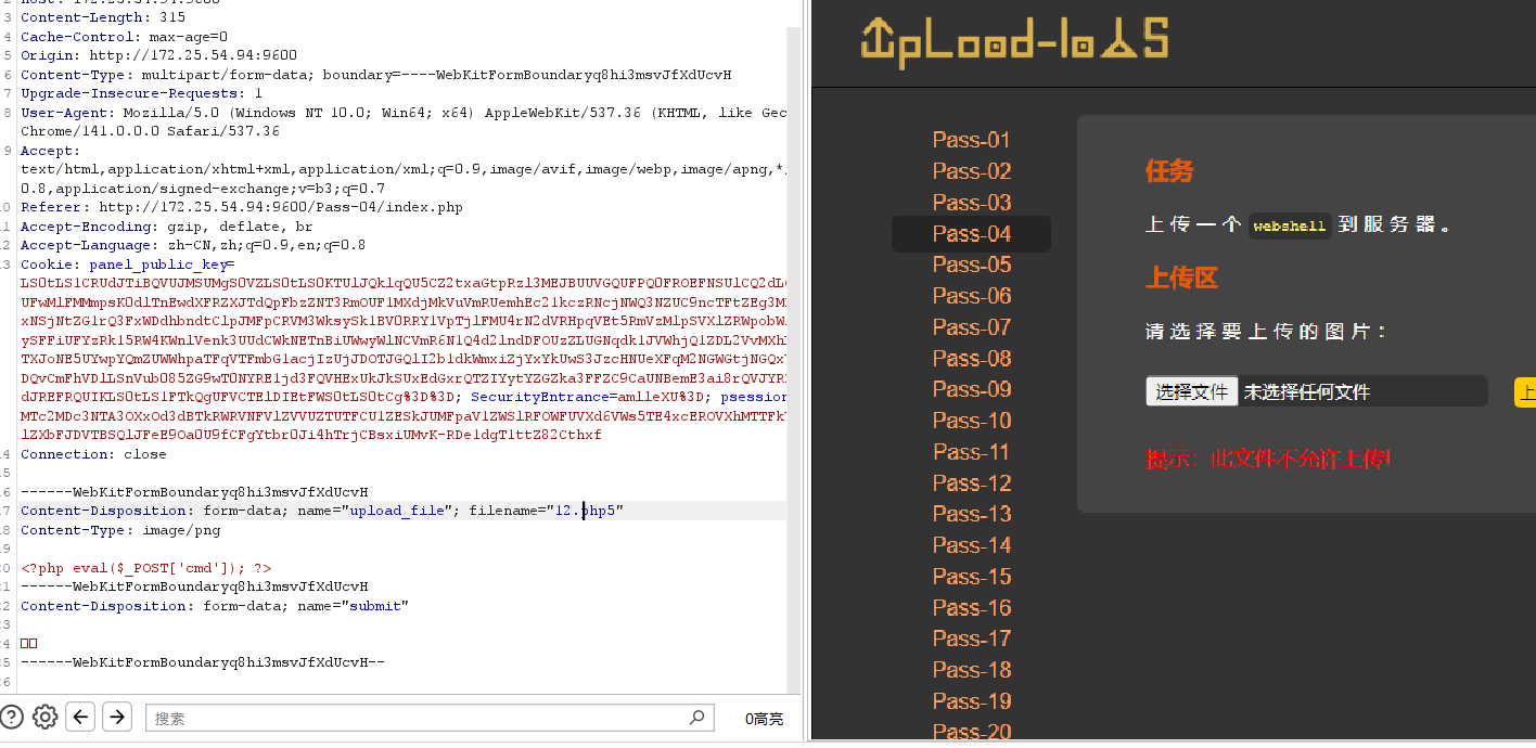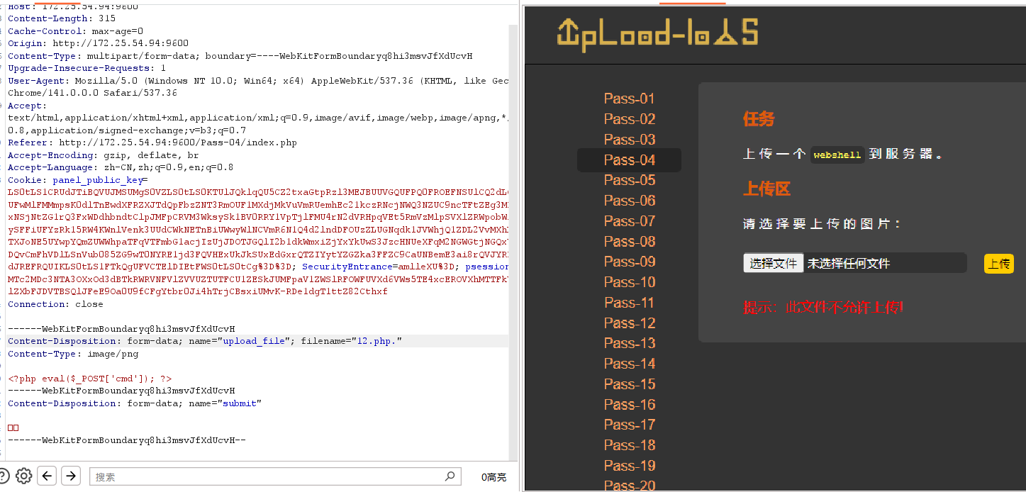 可以看到在最后上传的时候出现了过滤,不允许上传,说明这是在服务器端进行的过滤,不是在客户端进行的过滤,第一关和第二关都是在客户端做的过滤,所以我们可以直接修改后缀即可,这里的话其实很好绕过,进行大小写或者使用php4,php5等来绕过。