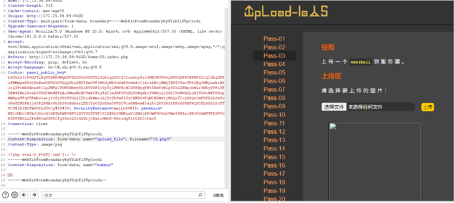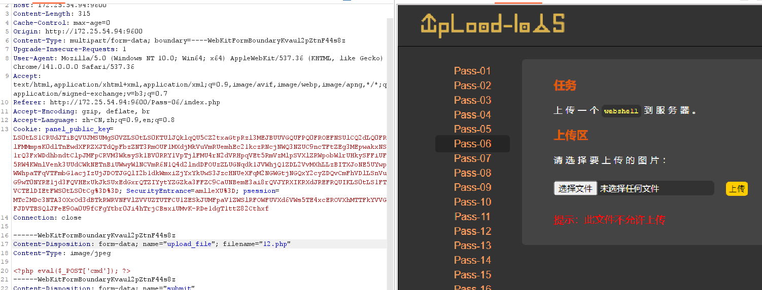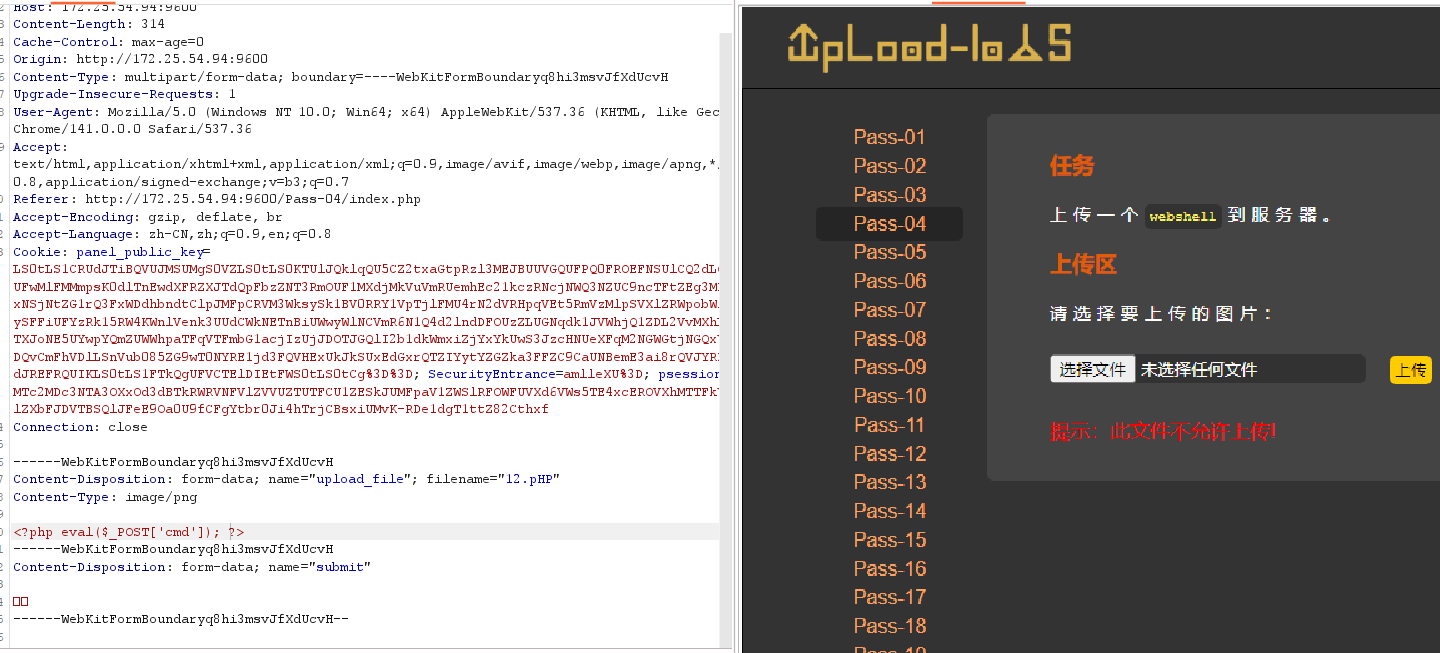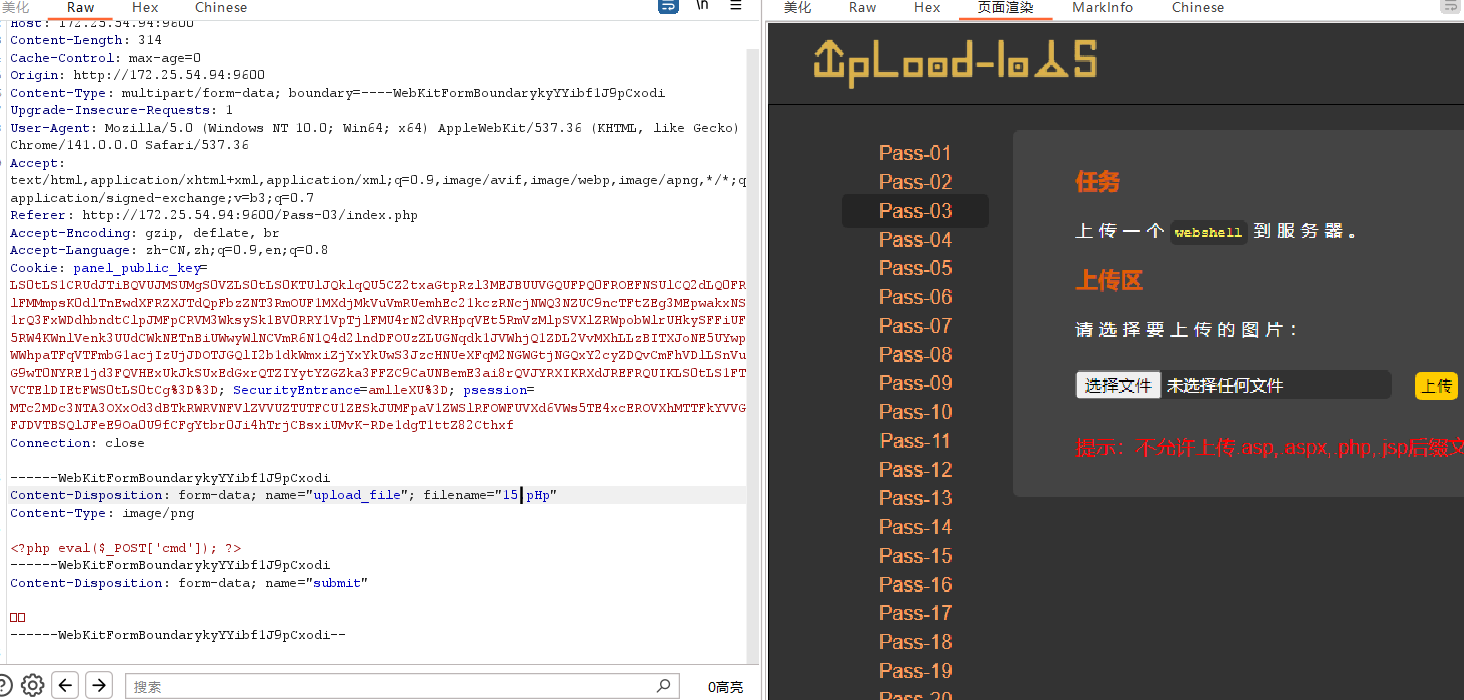 可以看到在最后上传的时候出现了过滤,不允许上传,说明这是在服务器端进行的过滤,不是在客户端进行的过滤,第一关和第二关都是在客户端做的过滤,所以我们可以直接修改后缀即可,这里的话其实很好绕过,进行大小写或者使用php4,php5等来绕过。