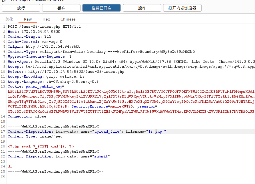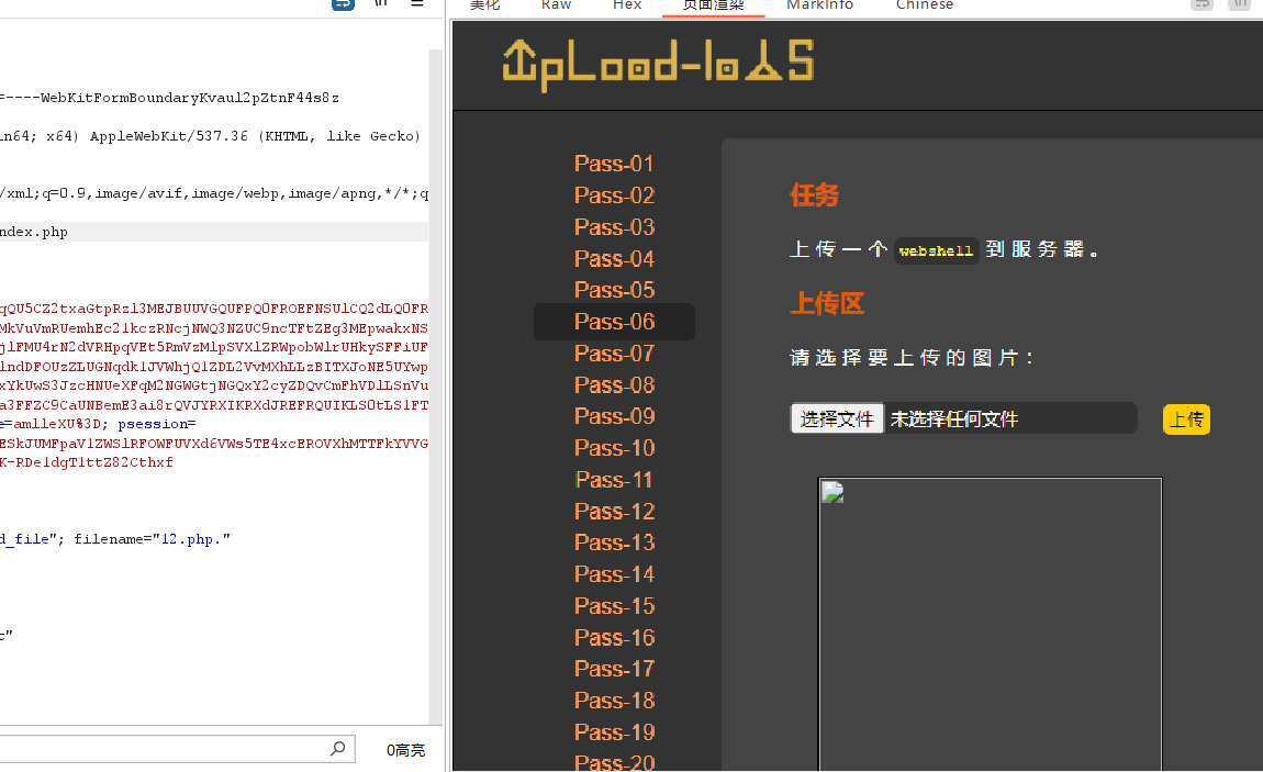 连接成功,第一关都是很简单的,抓包修改后缀就行。还有其它方法也可以绕过,因为这是前端验证,所以可以通过禁用本页面的javascript来进行绕过也是可以的。