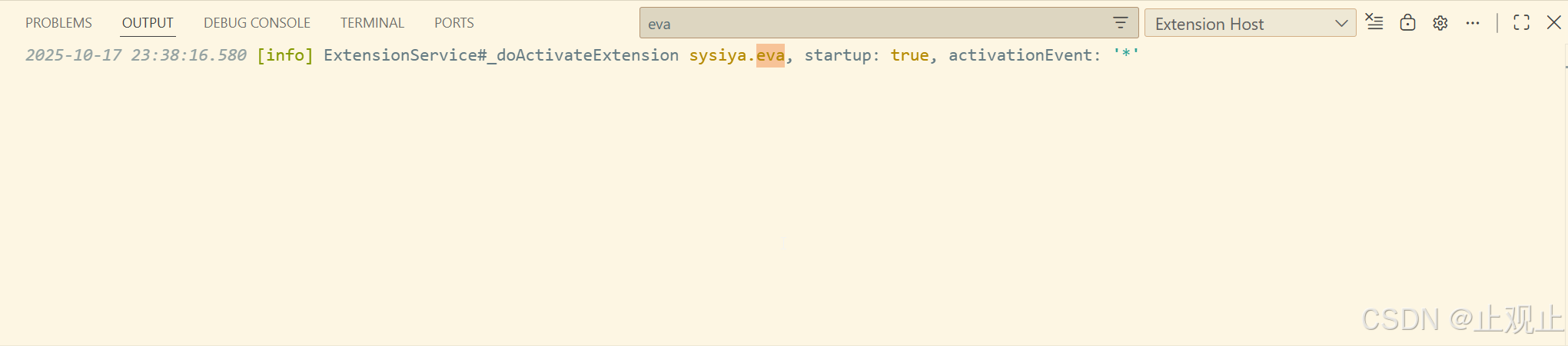 打开 Output 面板,选择 Extension Host 的日志并筛选 eva