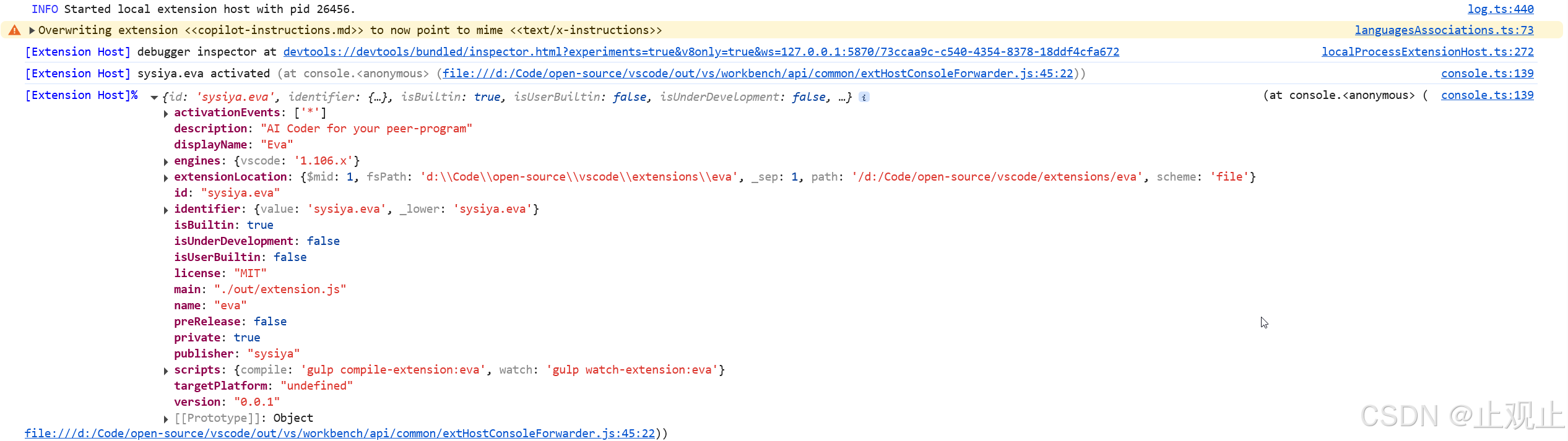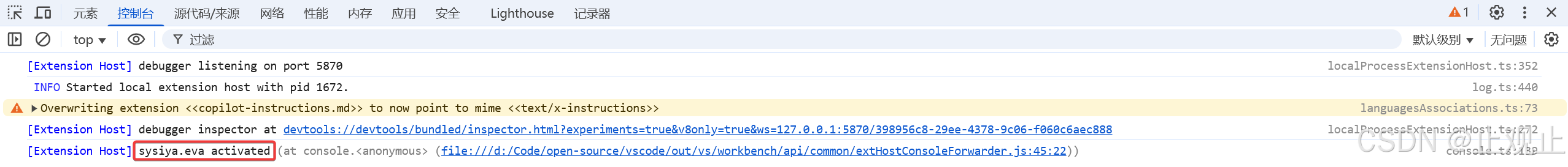 在启动命令的输出中,你可以看到 Extension Host 的输出 sysiya.eva activated