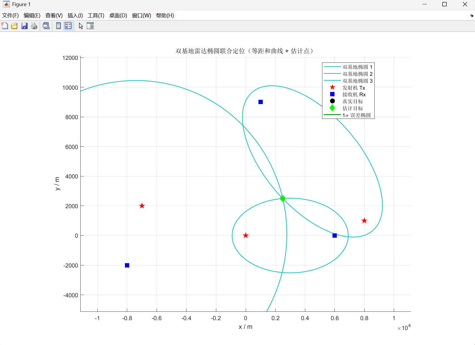 多基地(multistatic)雷达由多组相互独立的发射机(Tx)与接收机(Rx)构成。对收发分离 的双基地量测而言,目标到某一对焦点(Tx、Rx)的距离和 为常数,其等值曲线为椭圆。将多组双基地椭圆进行联合定位,即可在平面(或空间)内估计目标位置。本文系统给出几何模型、量测方程、最小二乘/最大似然求解、误差传播与 Cramér--Rao 下界(CRLB),并讨论可观测性、鲁棒估计与工程实现要点。