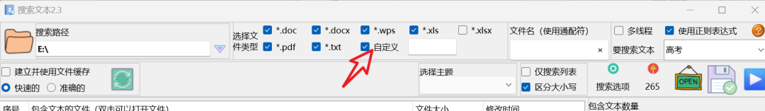 除了默认的doc、docx、wps、pdf、txt外,我们还可以自定义文件类型进行搜索。