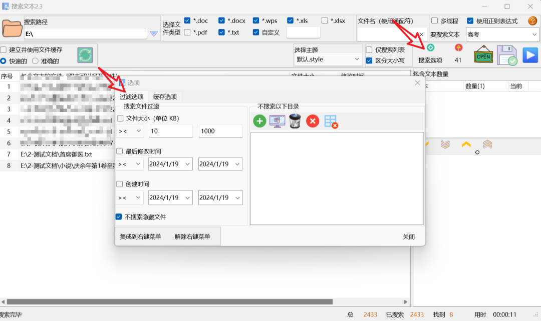 另外,我们还可以对搜索的文本内容进行设置,设置搜索文件大小、最后修改时间、创建时间等等,这样就能更精确的搜索出你想要的结果。