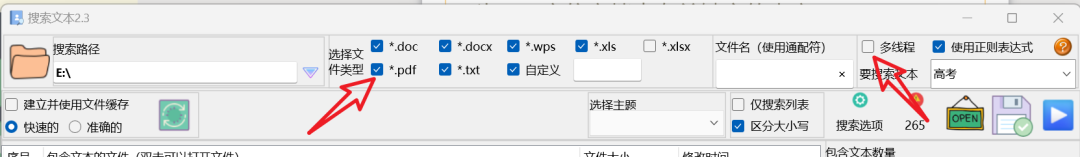 此外,我们默认的情况下是"多线程"搜索,这时候我们选择文件类型中的PDF时,软件可能会出错。所以我们多线程和PDF只勾选其中一个。