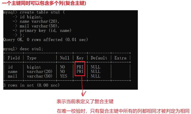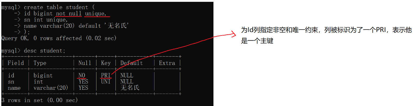 如果设置一个字段非空且唯一(id bigint not null unique)在desc查询表结构的时候会显示id的key为PRI