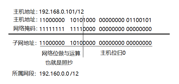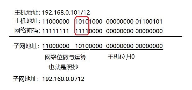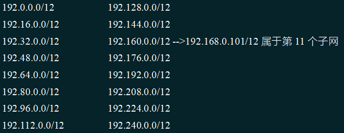原始网络的前缀长度是 /8,现在的前缀长度是 /12,这就说明划分了子网,因为从主机位拿走了4位作为网络位,增加了子网的数量,192.168.0.101/12 属于众多子网之一。