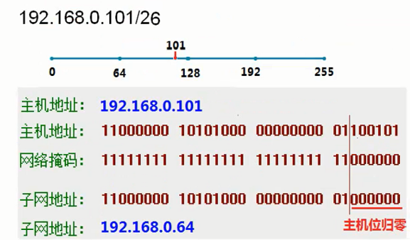 1、192.168.0.101/26 归属192.168.0.64网段。