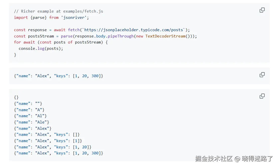 - jsonriver:一款简洁、高效的流式 JSON 解析器 ------ 用于增量解析流式 JSON 数据的库(例如从网络请求或大语言模型(LLM)中获取的数据流),能返回一系列"逐步完整"的值。