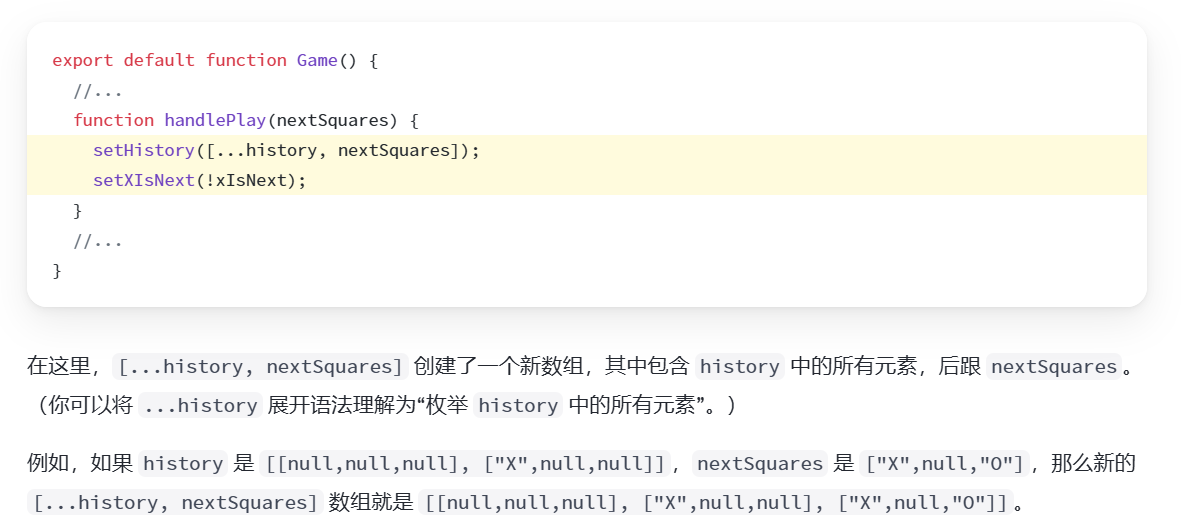 这段代码和说明是关于 React(或类似前端框架中)状态管理与数组展开语法的应用,核心是理解如何通过数组展开语法来维护 "游戏步骤历史" 这类序列型状态。
