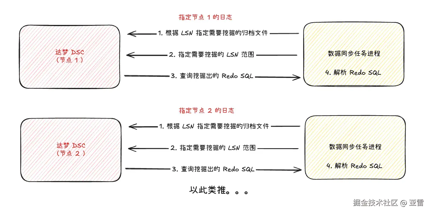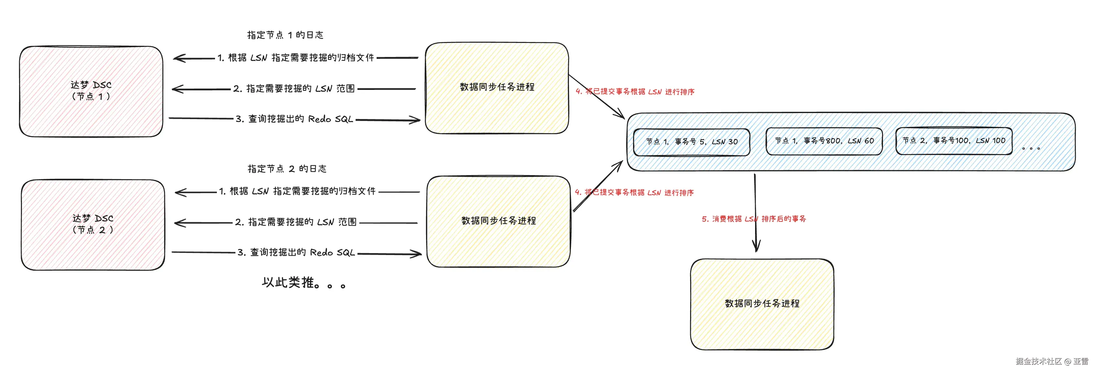 再次翻阅达梦文档,达梦文档有提到在故障重启的时候会根据事务提交的 LSN 排序,然后顺序消费排序之后的事务,我们延用达梦故障重启的思路,将多个实例上的事务号根据 LSN 进行排序,于是乎,分析日志的步骤:
