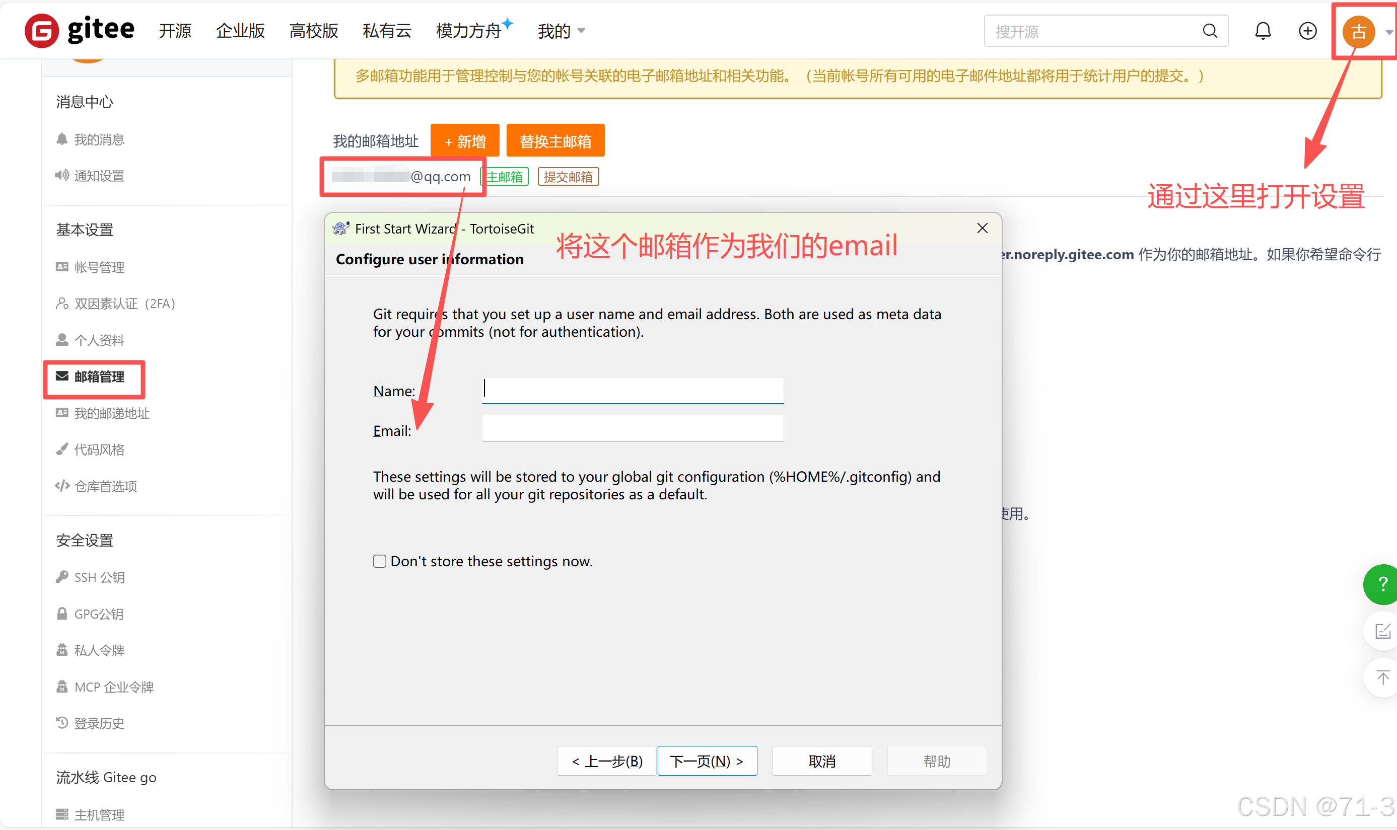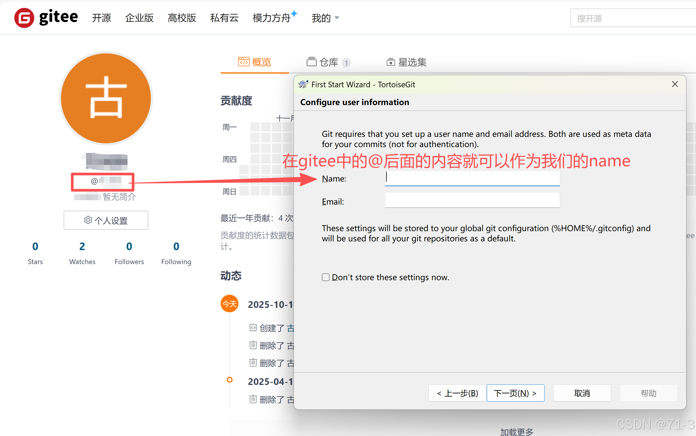 - 输入名字和邮箱(名字和邮箱的获取在下面有说,自己操作即可)