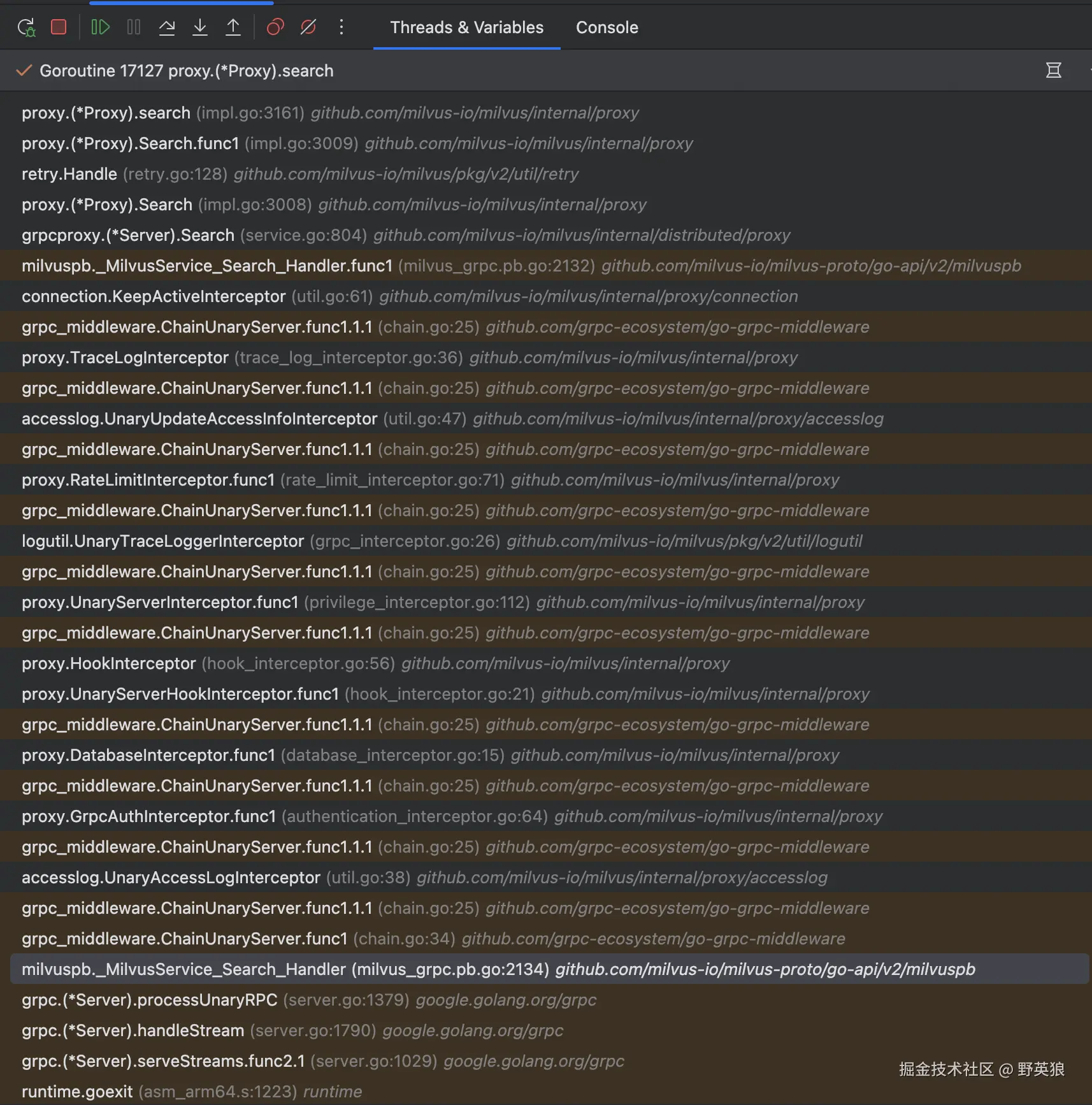 经过一系列的grpc的拦截器后到internal.distributed.proxy.impl.go#search