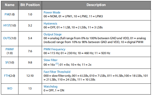 AGC(0x1A):自动增益控制,表示放大倍数,5V 下范围 0...255,3.3V 下 0...128。可用来补偿因温度变化、IC 与磁体之间的气隙以及磁体性能下降而导致的磁场强度变化。为了获得最稳健的性能,增益值应位于其范围的中间。