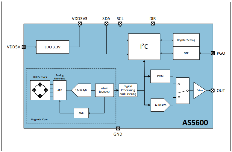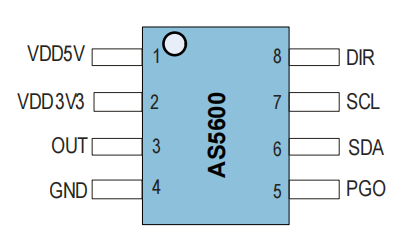 AS5600 还配备了智能低功耗模式功能,可自动降低功耗。输入引脚 (DIR) 可根据旋转方向选择输出极性。如果 DIR 接地,则输出值会随着顺时针旋转而增大。如果 DIR 连接到 VDD,则输出值会随着逆时针旋转而增大。