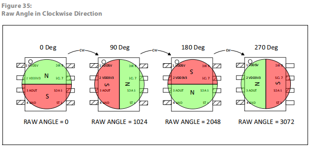 DIR 引脚控制磁铁旋转方向。如果 DIR 连接到 GND (DIR = 0),则从顶部顺时针旋转将产生计算角度的增量。如果 DIR 引脚连接到 VDD (DIR = 1),则计算的角度将逆时针旋转。