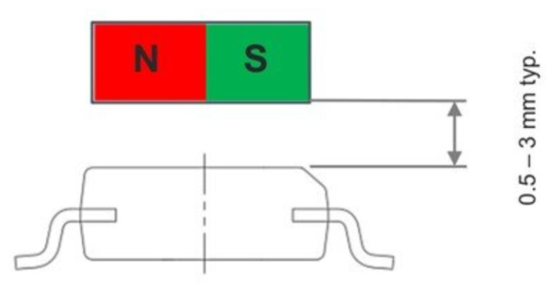 典型的径向磁铁感应气隙在 0.5 mm 到 3 mm 之间,这取决于所选的磁体。更大、更强的磁铁允许更大的气隙。以 AGC 值为指导,通过调整磁体和 AS5600 之间的距离,使 AGC 值位于其范围的中心,可以找到最佳气隙。当使用直径为 0.25mm 的磁体时,参考磁体的旋转轴从封装中心的最大允许位移为 6 mm。