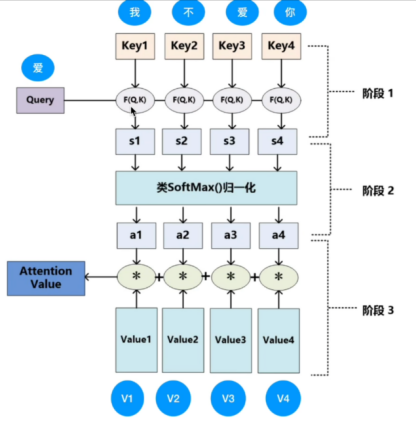 1,注意力分布公式如下:每个值的权重通过查询与对应关键字的点积来计算