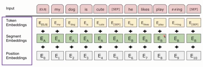 Token Embeddings 是词嵌入张量, 第一个单词是CLS标志, 可以用于之后的分类任务。