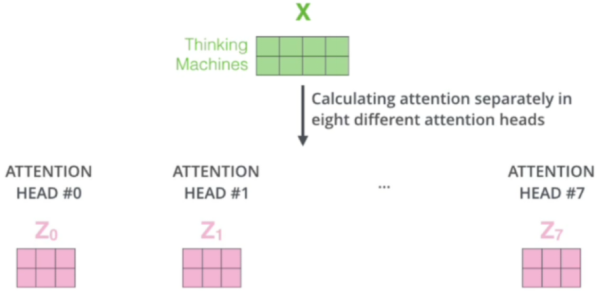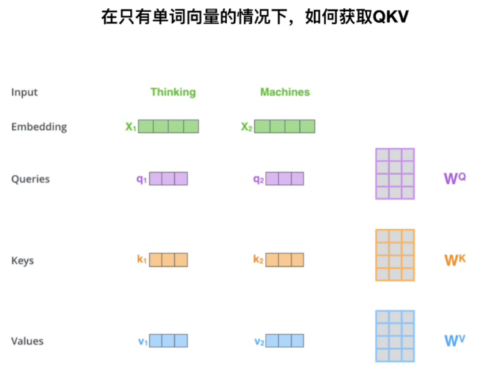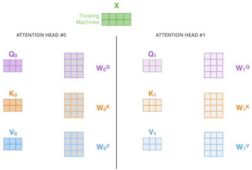 注:使用输入X和不同权重矩阵W相乘可以得到Q,K,V矩阵,其中权重矩阵W(Q),W(K),W(V),训练得到。一开始随机初始化,后面根据反向传播进行更新。