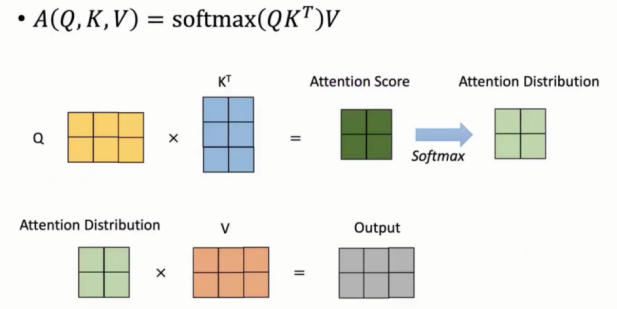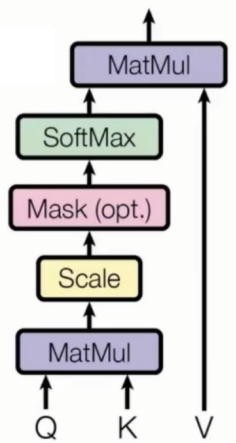 Q中每一行为一个q向量,Q矩阵与K矩阵相乘后得到注意力分数,softmax后得到注意力分布,最后与V乘积得到最后输出。