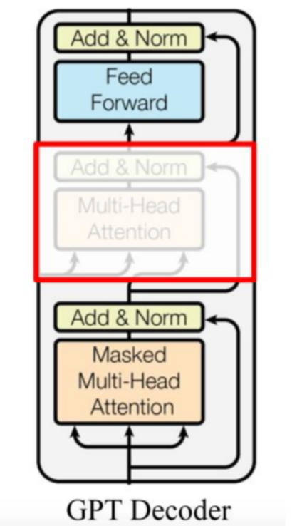 1,GPT中取消了第二个attention子层, 只保留Masked Multi-Head Attention层, 和Feed Forward层。