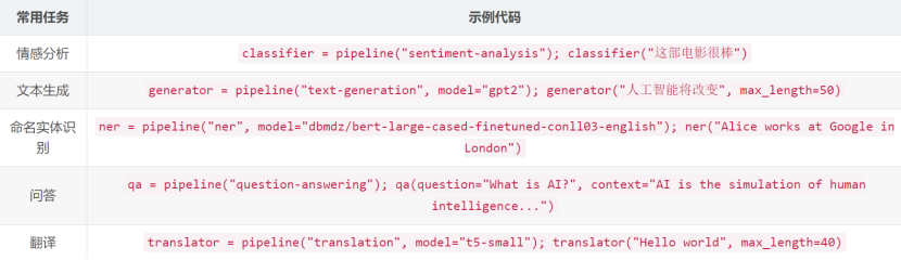 作用:简化推理流程,一行代码完成从文本输入到结果输出的端到端任务,支持多种NLP任务。