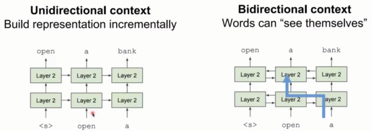 右侧双向:双向容易"信息泄露"。由于是双向的,进行预测时,在双向解释器内单词是可以看见自己的,因此不做深度学习以及推理。