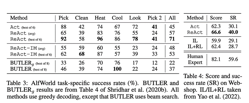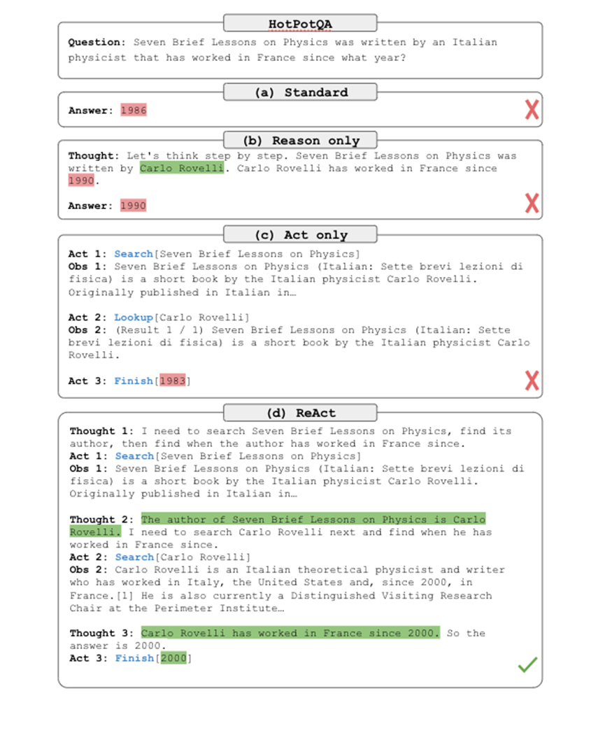 ReAcT 提示 LLM 生成与任务相关的口头推理跟踪和作,以便模型显示高级推理。ReAcT 为行动(行动的理由)以及与环境交互以检索推理的附加信息(行动到理由)创建高级计划。该论文对以下内容进行了测试:
