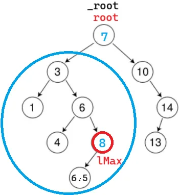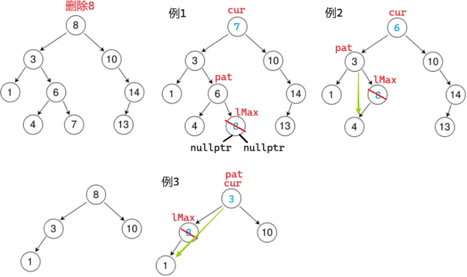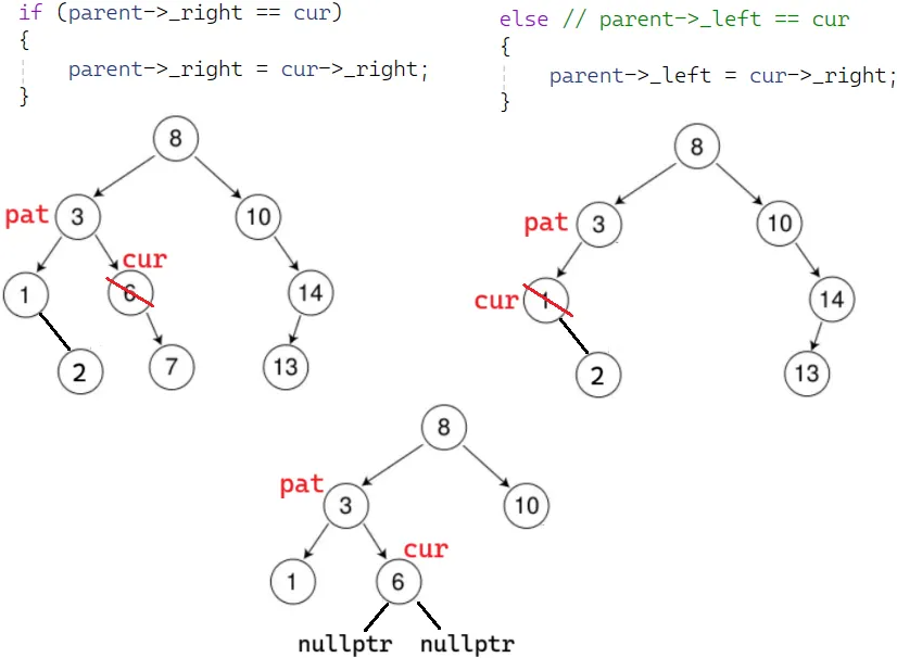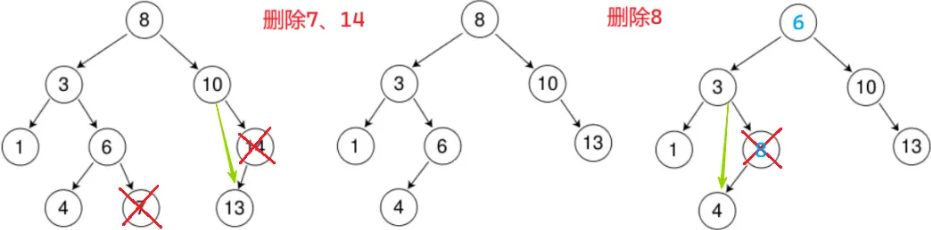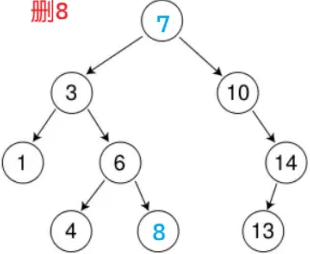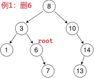 可以转化为在蓝圈的树中删,递归往下走,一定是右为空的情况。那时,root 是 6 的右指针的别名