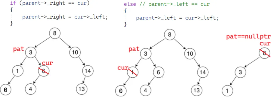 转化为删红圈的节点。非递归实现一定可以找父亲,直接删;不能递归删