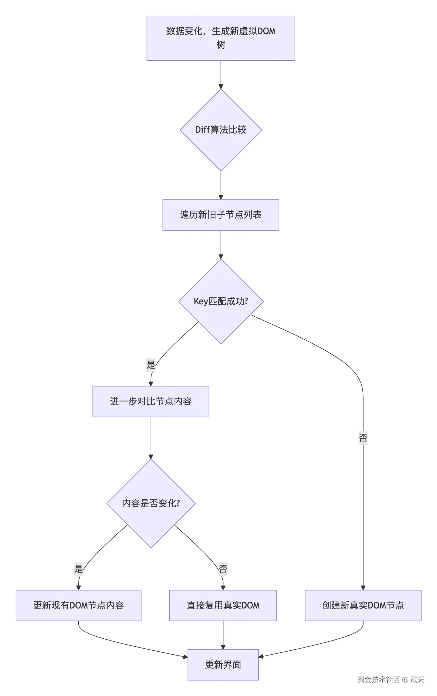 等)。如果节点内容(如文本、属性)没有变化,则直接复用之前的真实 DOM 元素;如果内容发生了变化,则更新真实 DOM 节点的相应部分。这避免了完全推倒重来的开销。 - 处理新增与删除 :如果在新列表中发现某个
