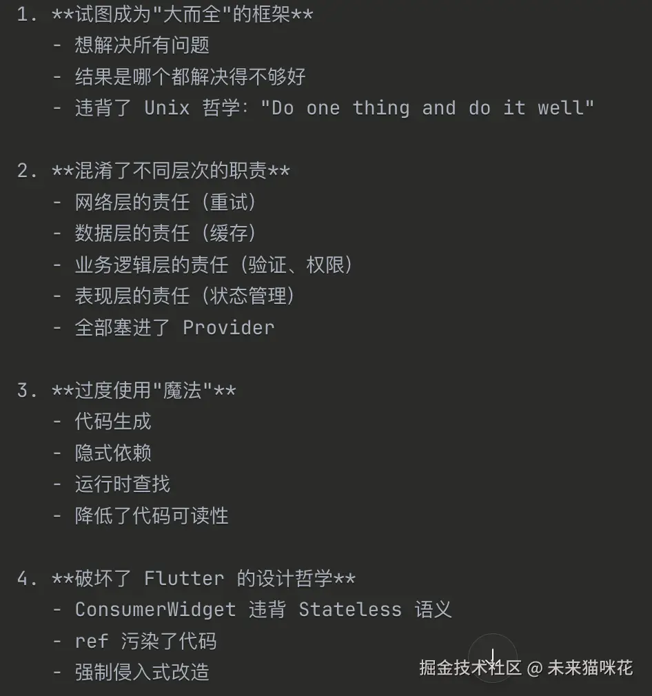 Riverpod 3.0 作为 Flutter 社区备受推崇的状态管理方案,被许多开发者视为"最佳实践"。然而,当我们深入分析其设计理念和实际使用体验后,会发现这是一个典型的过度设计案例。本文将从架构设计、语义一致性、代码可读性等多个维度,剖析 Riverpod 3.0 的设计缺陷。