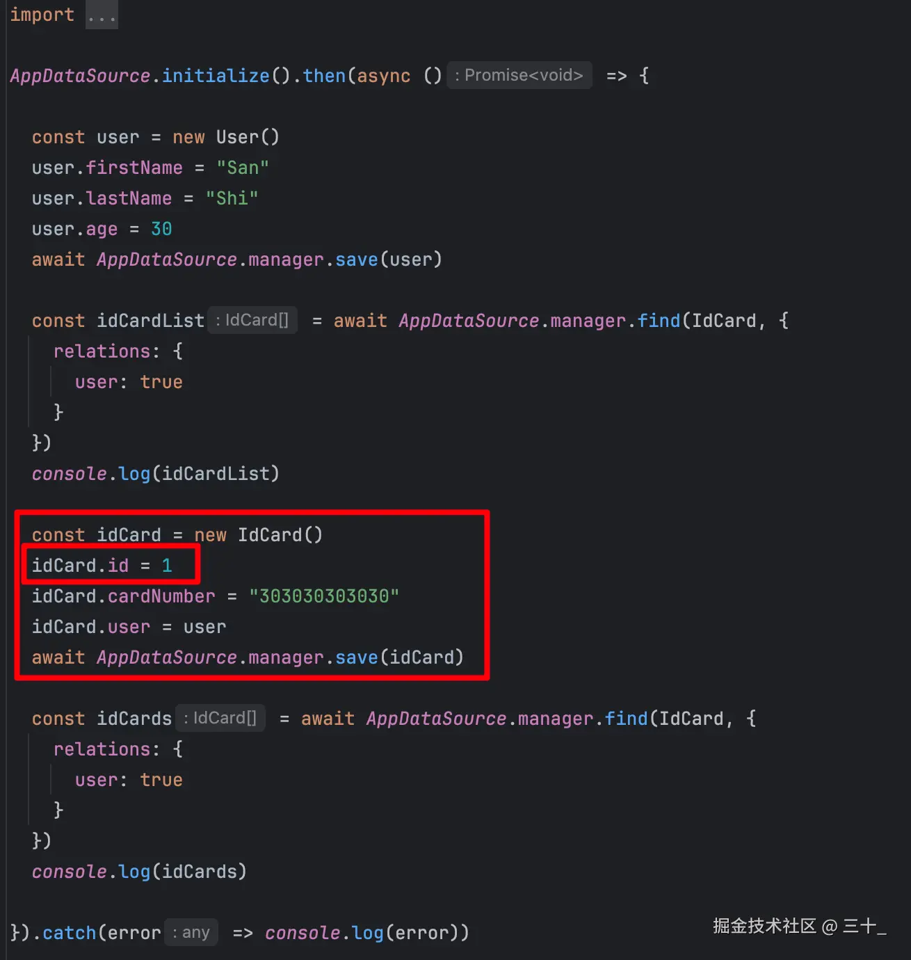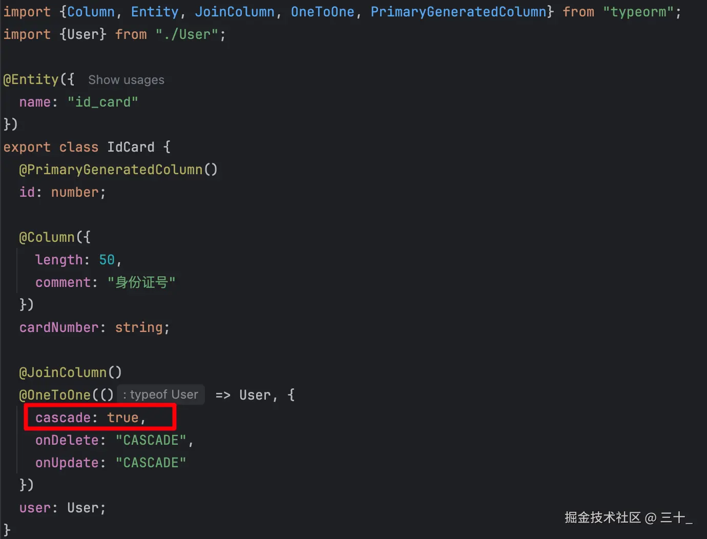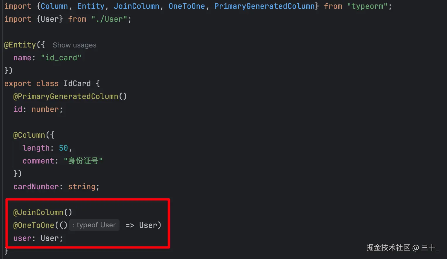 指定它和 User 是一对一的关系- @JoinColum() 指定外键列在 IdCard 表中维护