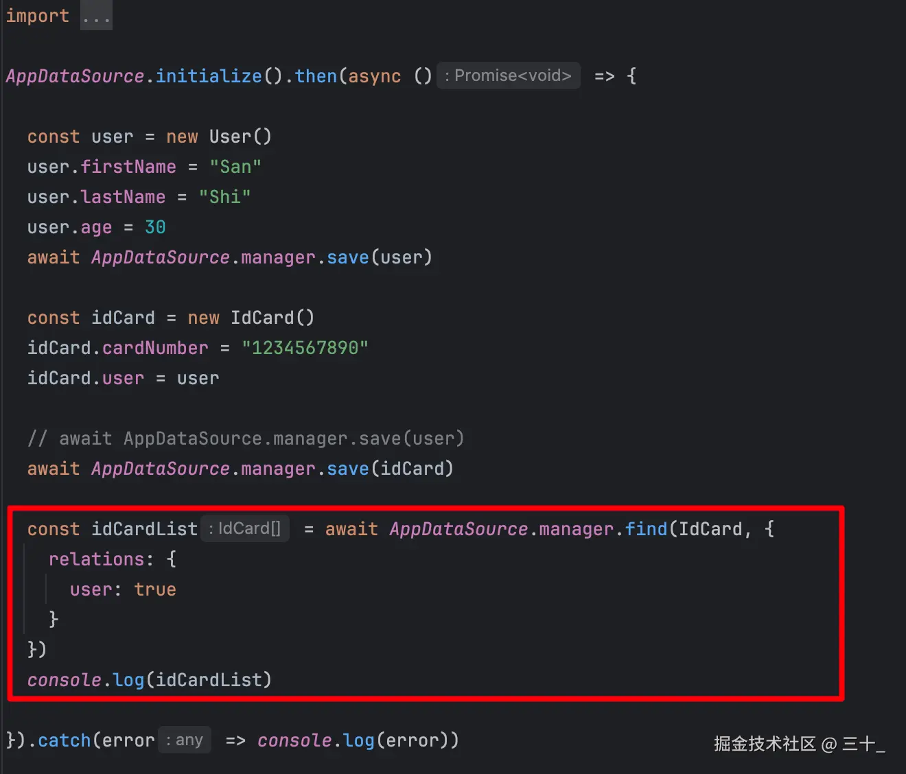 在 find 方法中通过 relations 来声明关联查询,反之不进行关联查询。