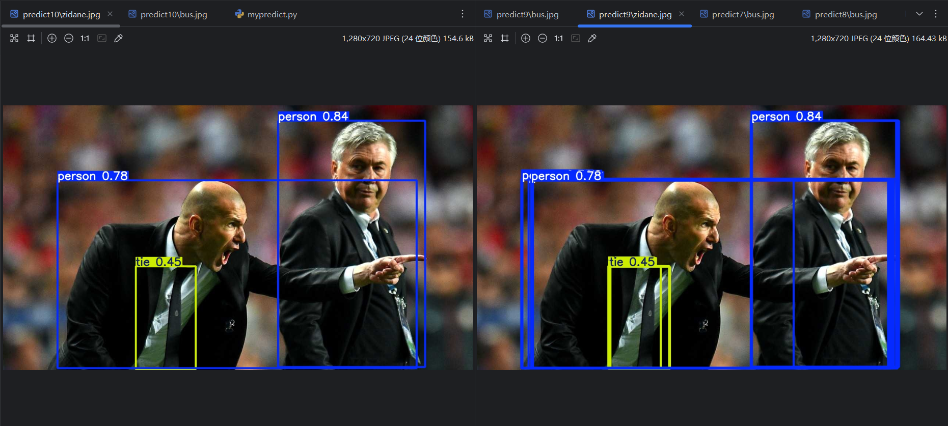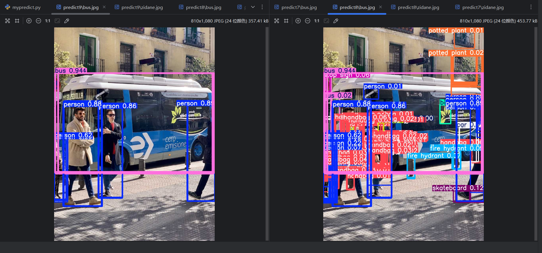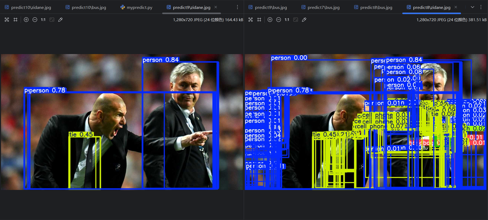 将conf改为0.9,重新运行,可以看到少了一些预测结果: