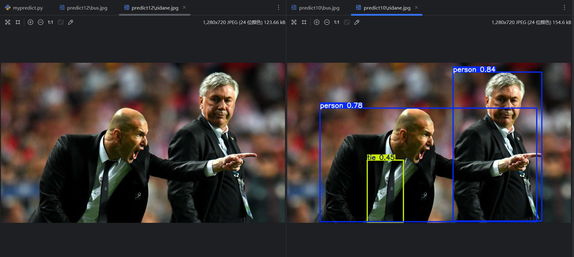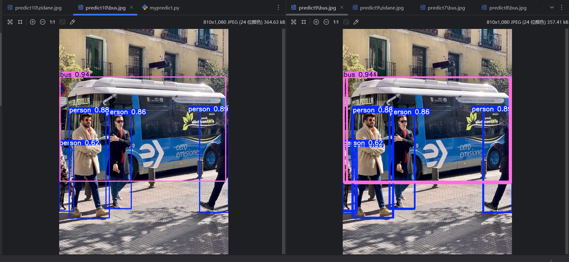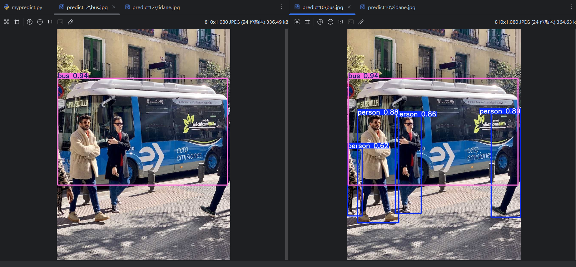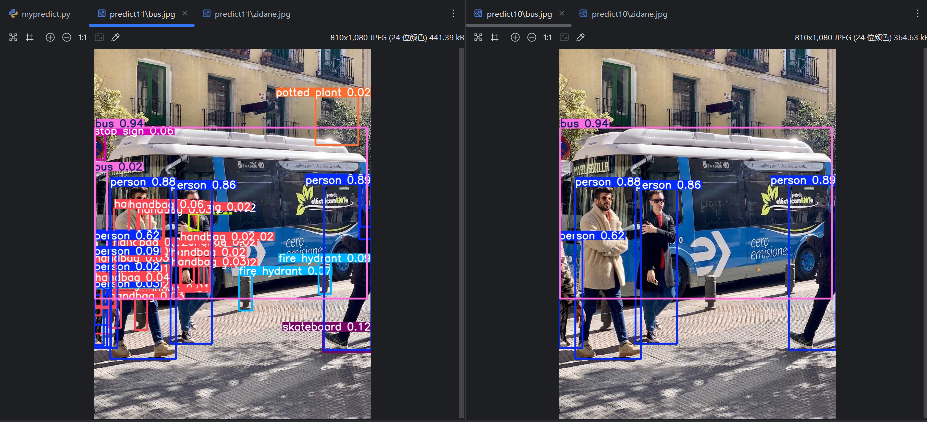 查看16个模型的训练效果,打开mypredict.py,分别查看不同模型的验证集和测试集的预测效果。这里以yolo11m.pt模型为例: