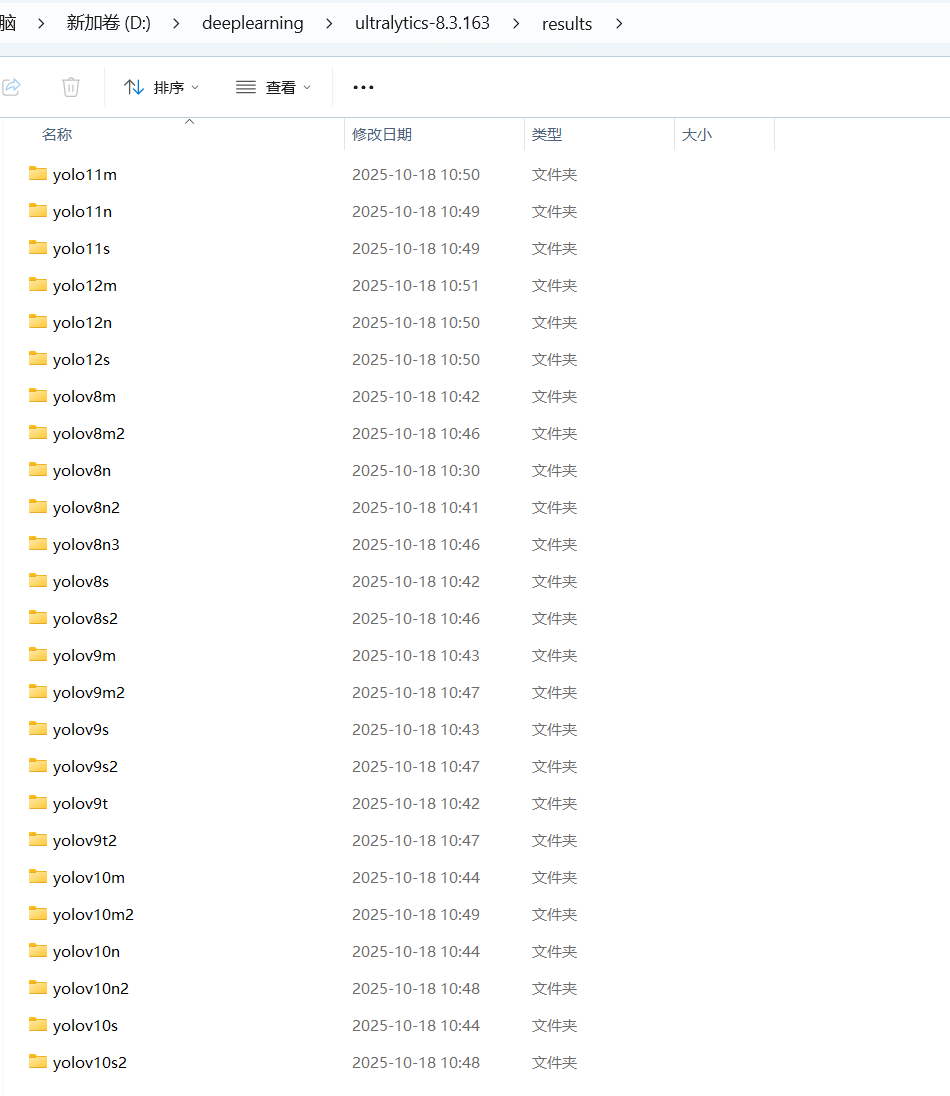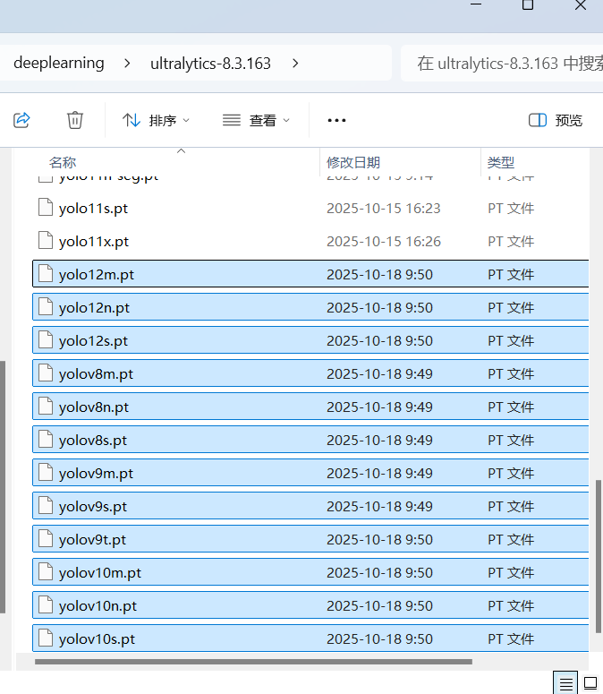 从网址下载YOLOv8,YOLOv9,YOLOv11,YOLOv12最小的三个模型(n/s/m),放置到ultralytics-8.3.163文件夹下。后面将测试他们的效果。