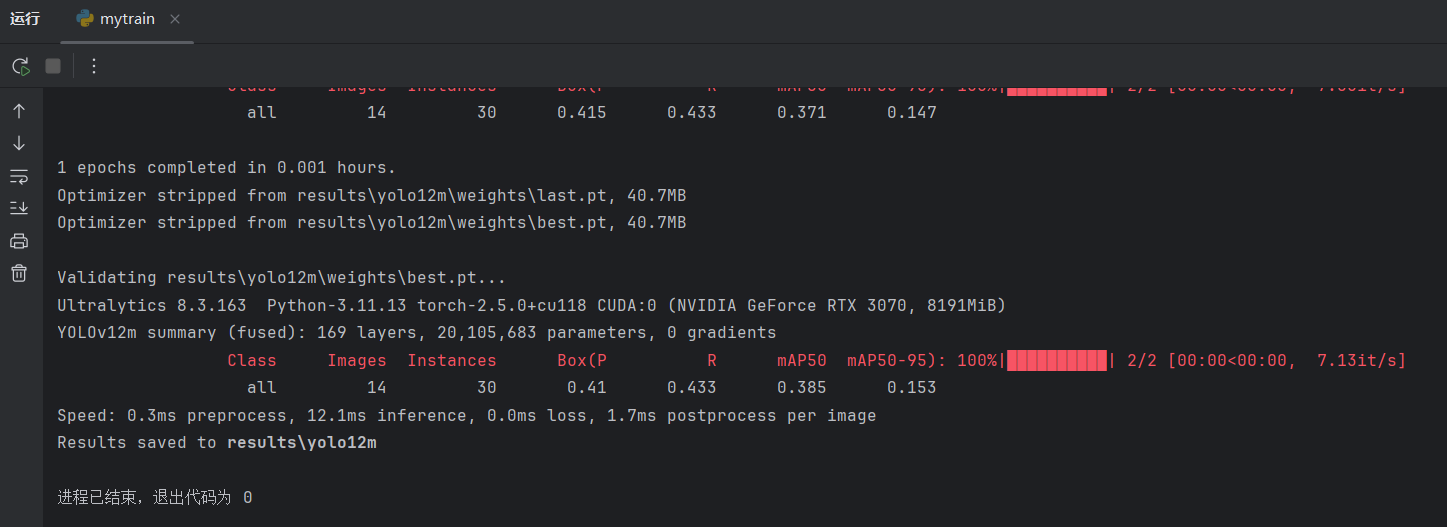 开始大规模训练前,最好先测试小规模训练是否能够跑通。epochs设置为1,让每个模型先只跑一轮,确保小规模训练能跑通,再进行训练: