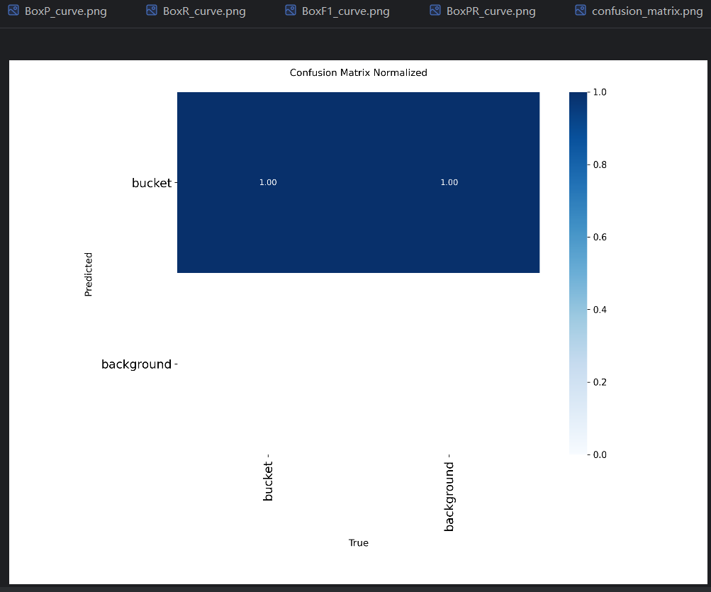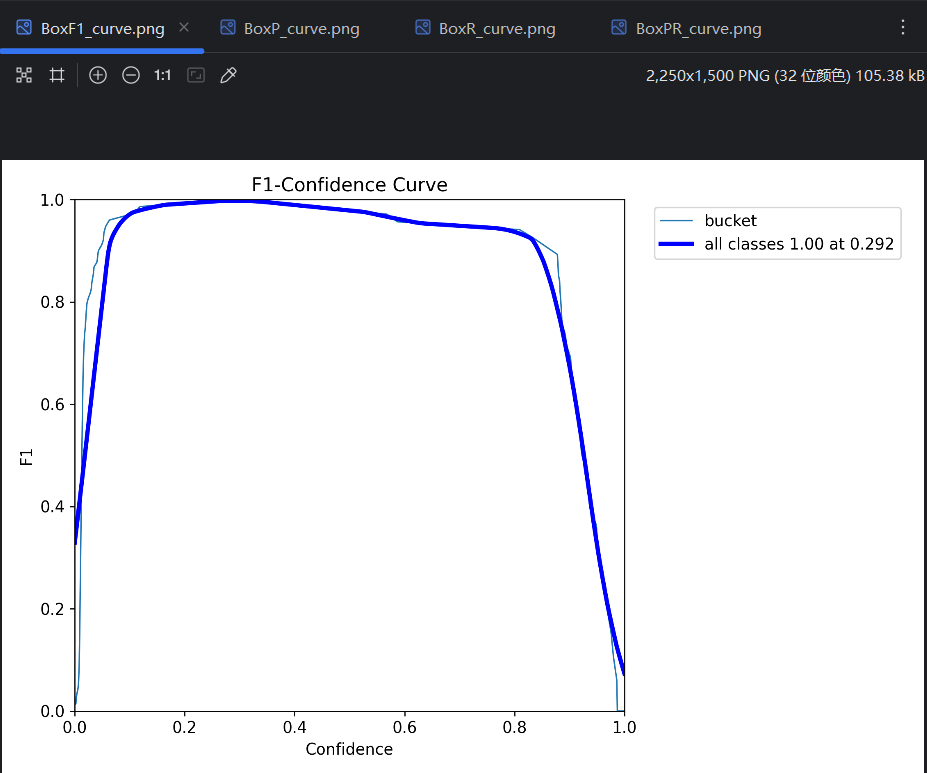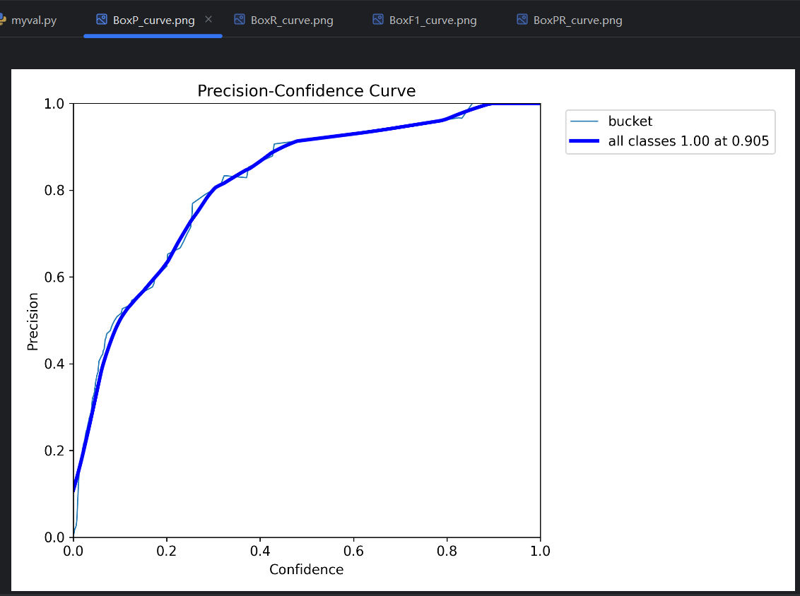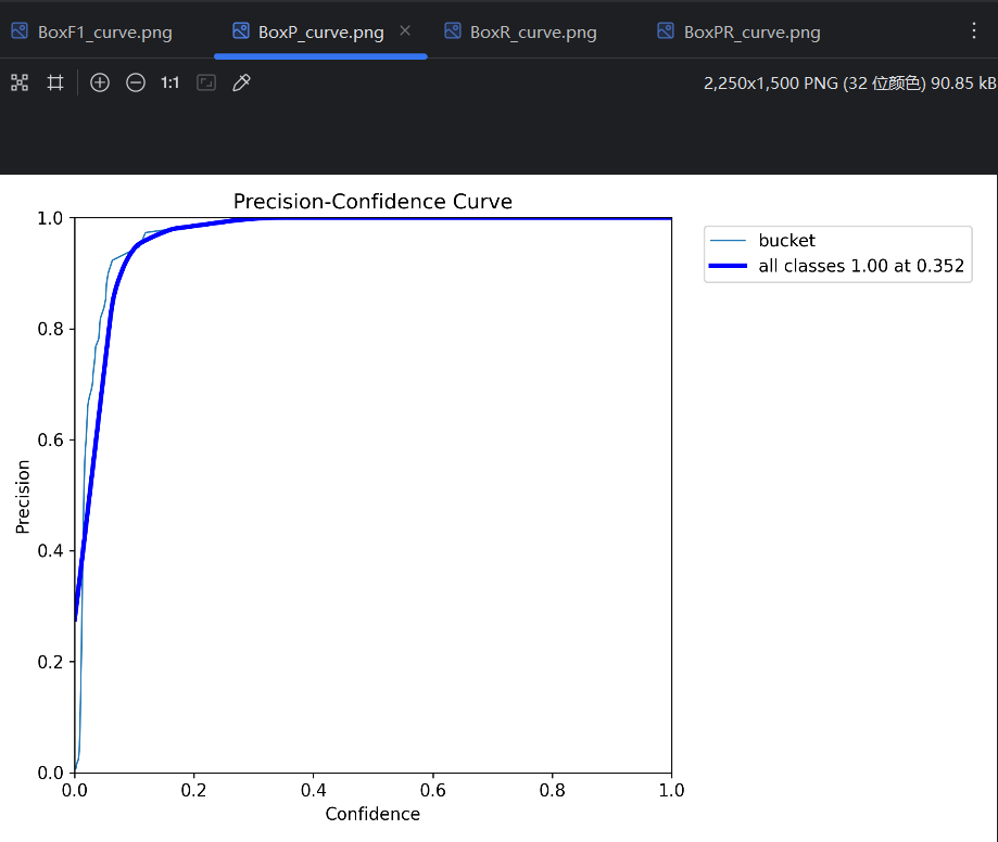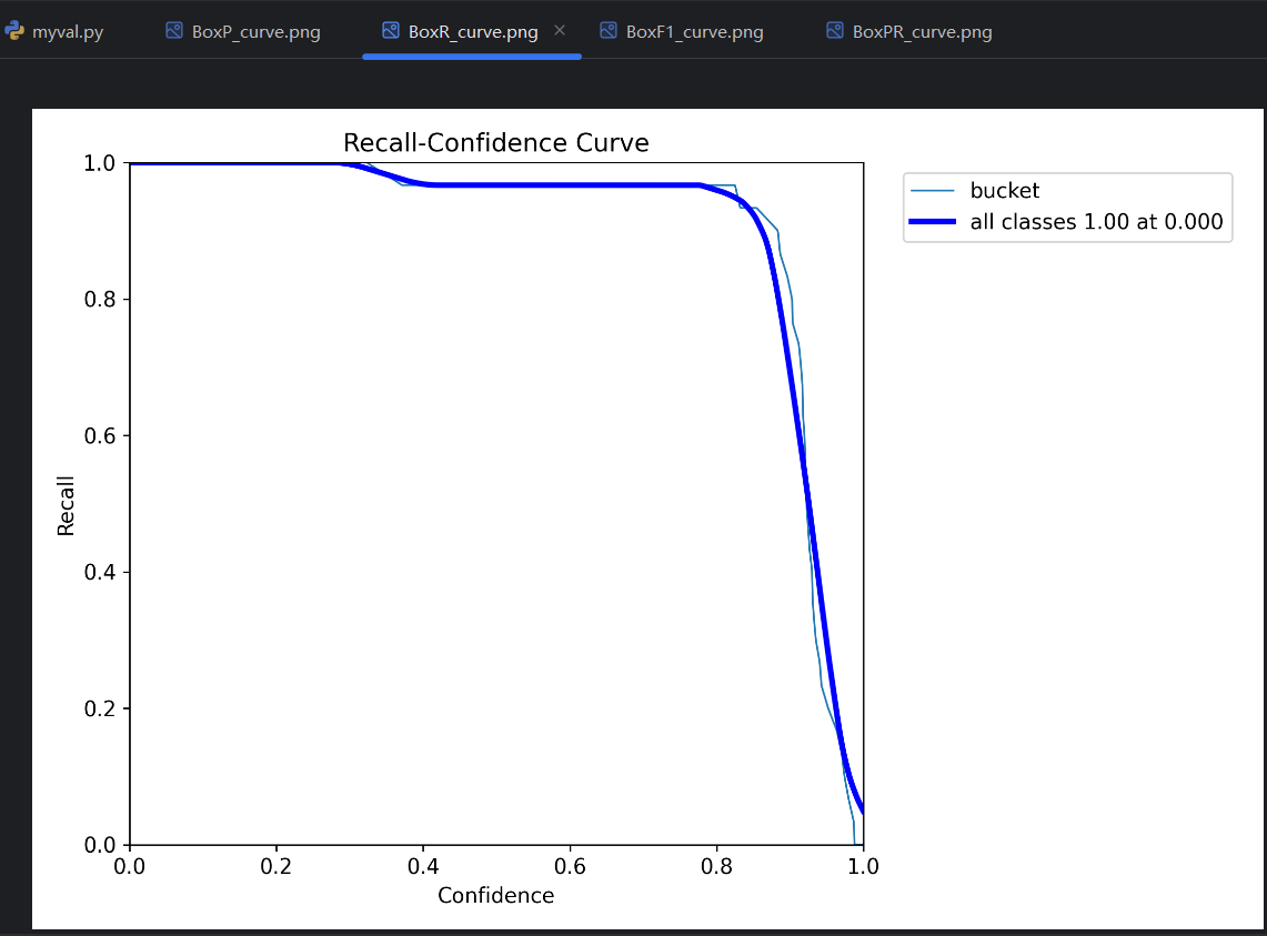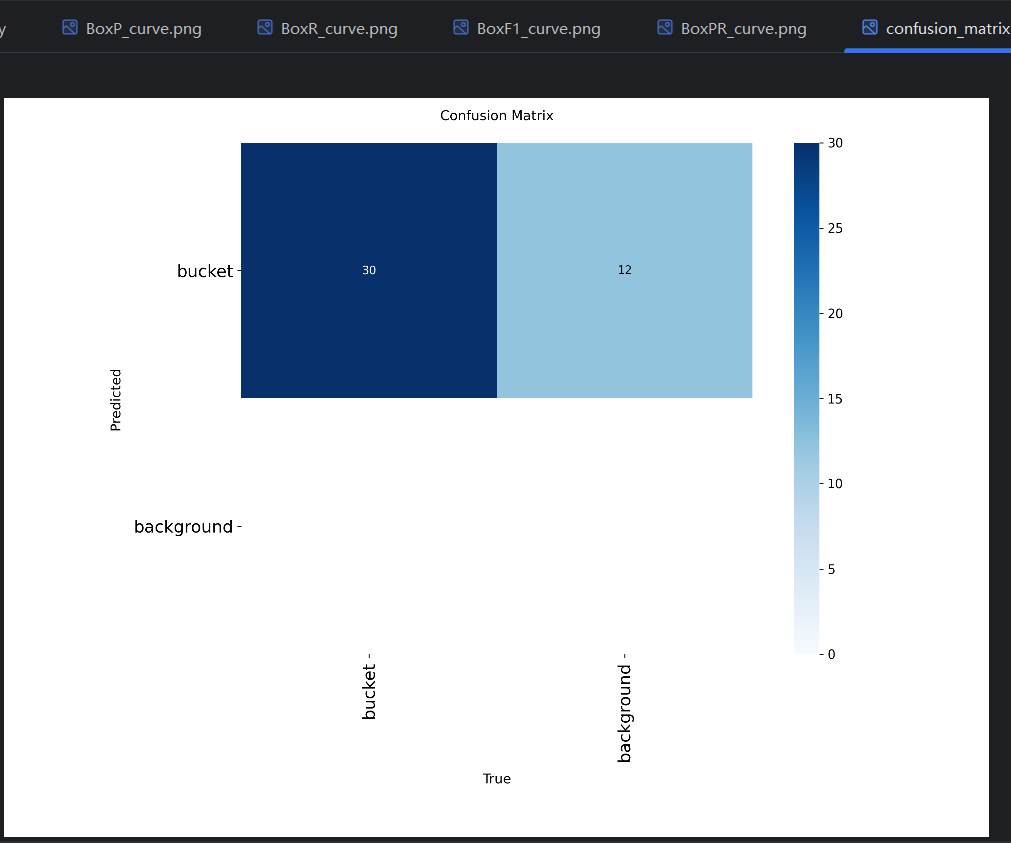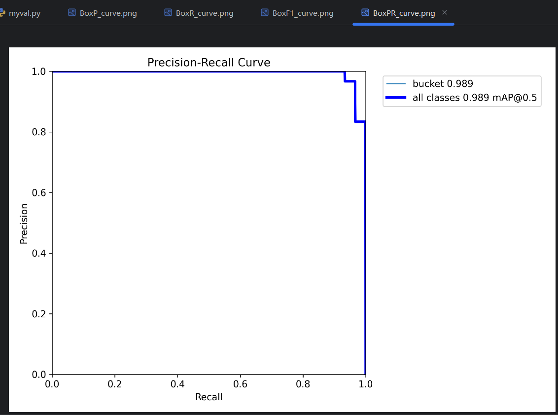 - AP :平均精度(Average Precision),PR曲线 线下的面积是0-1的小数,这个面积就叫AP。比如图中bucket类型的PR曲线的线下面积是0.995,就可以说模型在bucket类型上的AP是0.995。