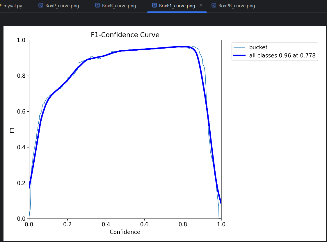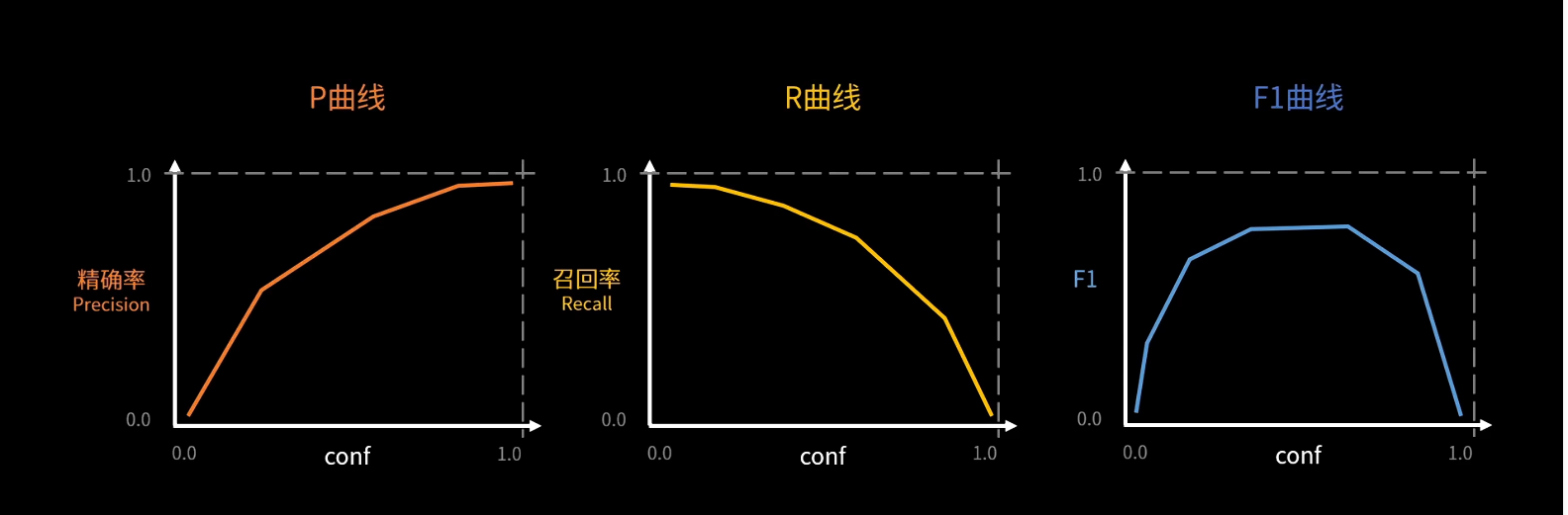 conf不能太低,不然会导致精确率太低;conf不能太高,不然会导致召回率太低,出现很多漏报。一般以F1曲线 最高点处的conf值为设置值,对应的P、R和F1简单理解为模型的P、R和F1。训练的时候,每一轮的P、R就是这样得到的。