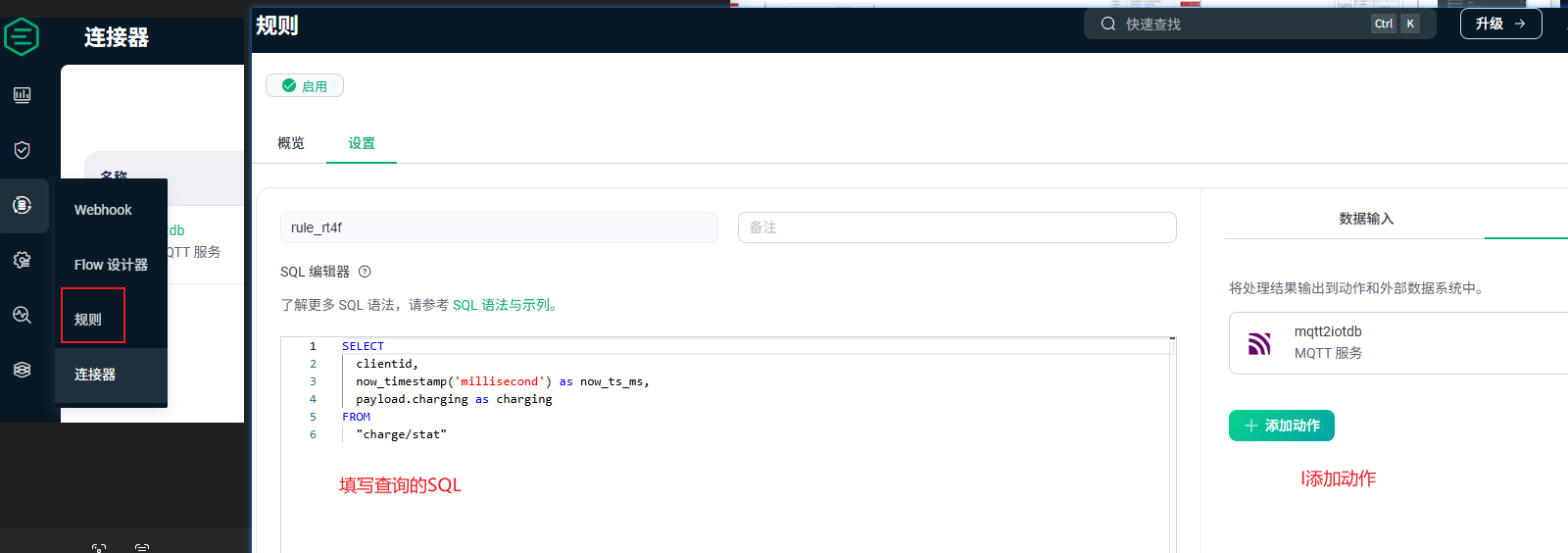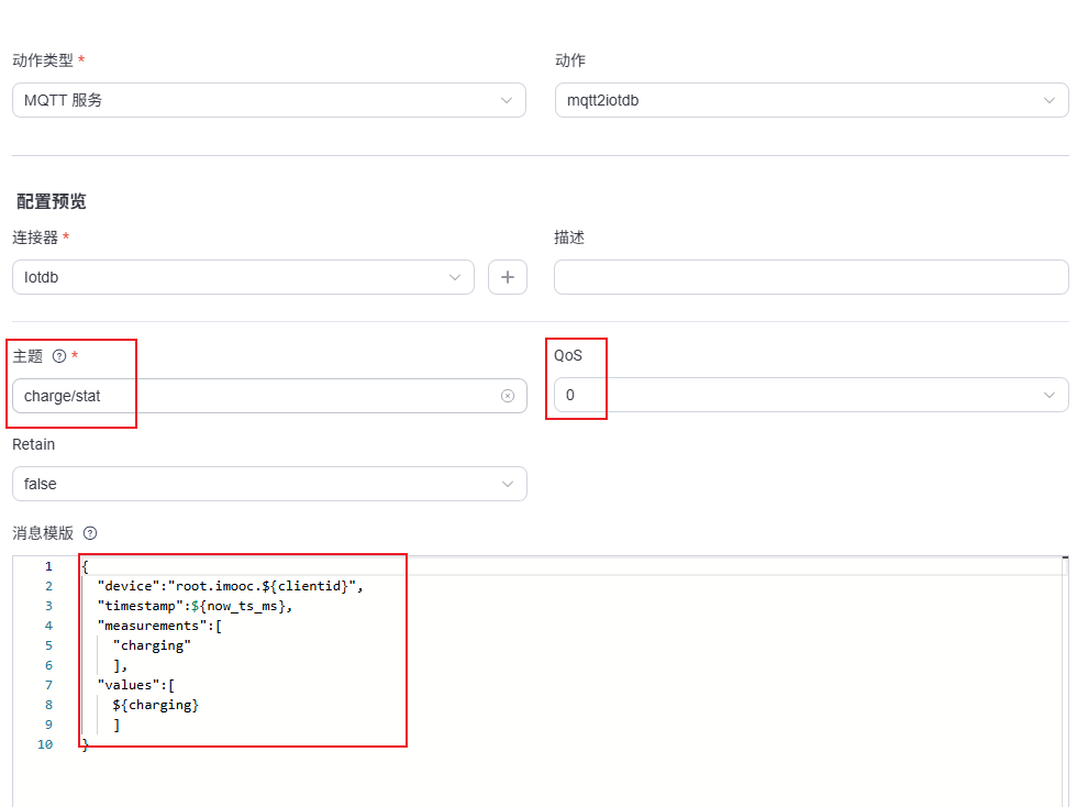 这里主要是选择连接器和主题,然后填写消息模板,消息模板要写对,否则消息无法保存到IotDB中。消息模板的示例: