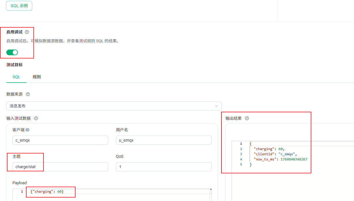 主题必须与SQL中from后面的主题保持一致,Payload也必须SQL中的payload点后面的值保持一致,编写完点击运行测试,如果无误,可以在输出结果中看到正常输出的结果。