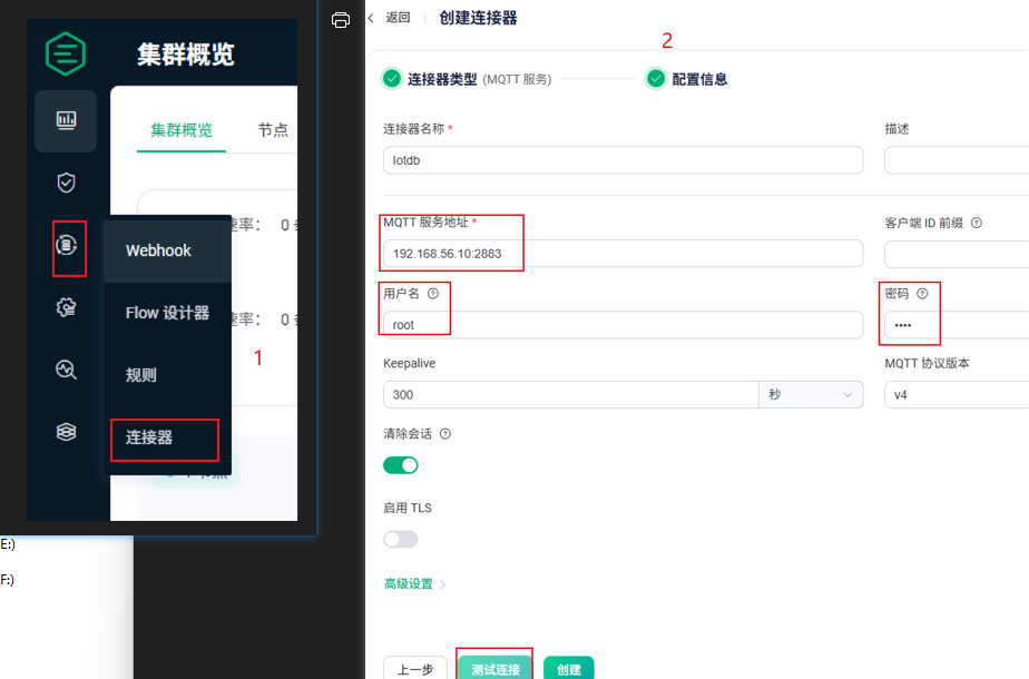 连接器上填写的信息MQTT服务地址,为上面启动的Iotdb容器的服务器地址和端口,用户名和密码默认为root。填写好点击下方的测试连接,如果提示连接成功,则进入下一步。