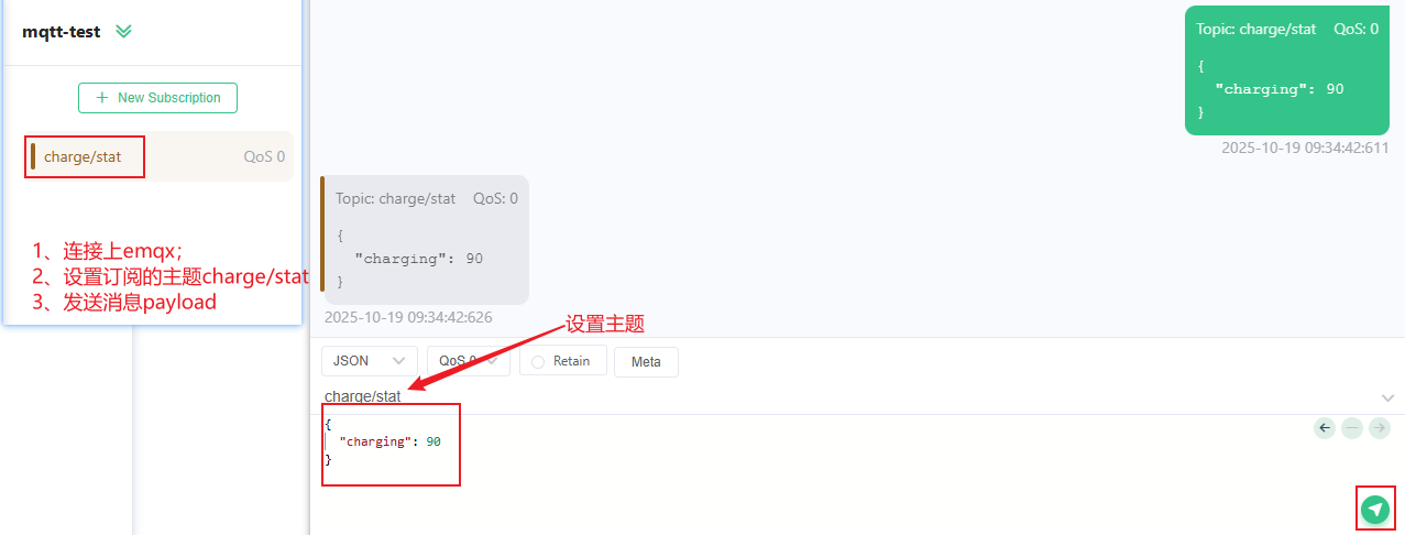 FROM中的charge/stat为主题,payload.charging为发送的消息