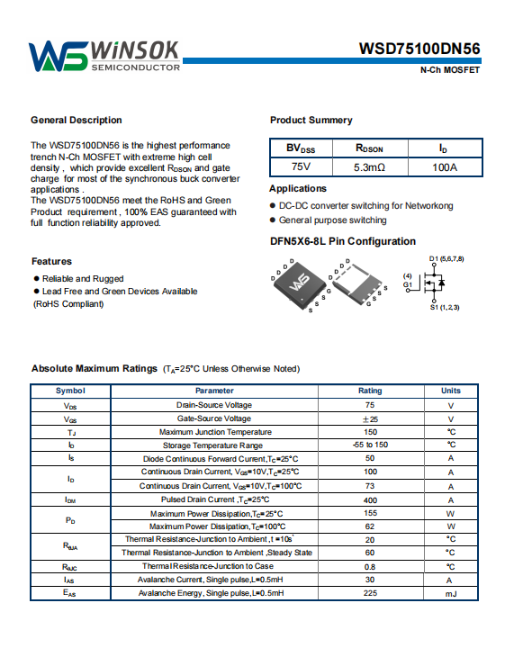 随着"零重力"座椅向15万元车型下沉,前排通风风扇需在10秒内建立4500 rpm转速,电机电流达100 A,对功率器件提出"超低导通电阻、超大电流、高雪崩能量"三重挑战。微硕WINSOK推出的WSD75100DN56 N沟MOSFET,以75 V耐压、5.3 mΩ超低导通电阻及DFN5×6-8L封装,单颗即可连续输出100 A,两颗并联组成H桥同步整流,助力通风风扇模组减重25 %、效率提升6 %,成为主机厂布局"静音通风+快速启动"座椅的理想功率级方案。